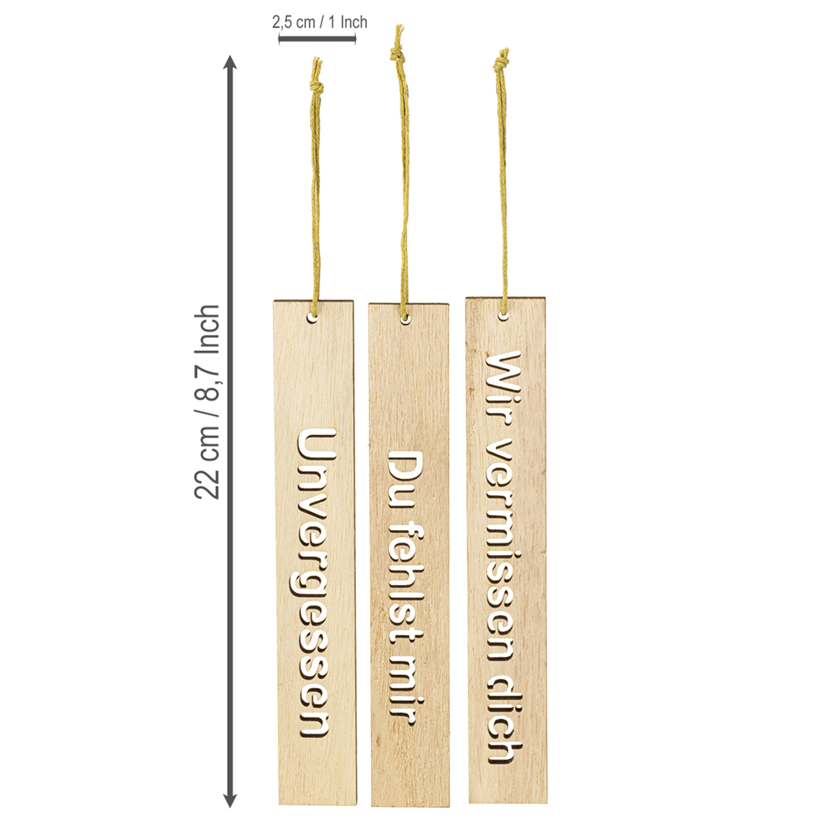 Das Set enthält 12 Holzhänger in drei verschiedenen Ausführungen, sodass Sie stets die passende Botschaft auswählen können. Die Sprüche „Unvergessen“, „Du fehlst mir“ und „Wir vermissen dich“ wurden mit viel Liebe zum Detail gestaltet und verleihen den Anhängern eine tiefe, emotionale Note. Diese können in Kombination mit Trockenblumen, Trauerkränzen oder auch Einzelgestecken auf einzigartige Weise eingesetzt werden. Probieren Sie es aus: Ein Holzhänger direkt in einem Beileidstrauß platziert, schafft eine bewegende Wirkung.