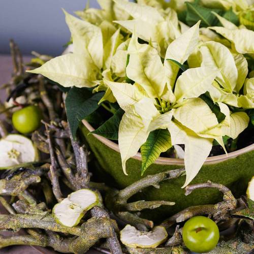 Ob für einen Adventskranz oder ein Herbstgesteck: Dieser künstliche Mini Apfel ist an einem biegsamen Metalldraht angebracht und kann hervorragend in jedes Werkstück eingebaut werden! Wickeln Sie den Draht dafür ganz einfach um das Metallgerüst einer Kranzunterlage, um einen Ast oder einen Blumenstiel. Sie können die Deko-Äpfel auch in klassische Floristikbedarfs-Materialien wie Steckschaum, Stroh und Styropor einarbeiten. Und durch die kräftige, helle grüne Farbe harmonieren die Kunstäpfel sehr schön mit roten Äpfeln und weiteren Dekofrüchten, die besonders gut als Erntedankdekoration funktionieren.