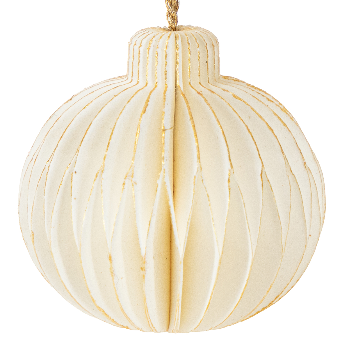 Das helle Weiß, akzentuiert durch feine mattgoldene Kanten, sorgt für ein harmonisches und zeitloses Gesamtbild. Ob an großen Weihnachtsbäumen oder als liebevolle Verzierung am Tischweihnachtsbaum – dieser hängende Baumschmuck aus Wabenpapier zieht die Blicke auf sich und setzt stilvolle Akzente.