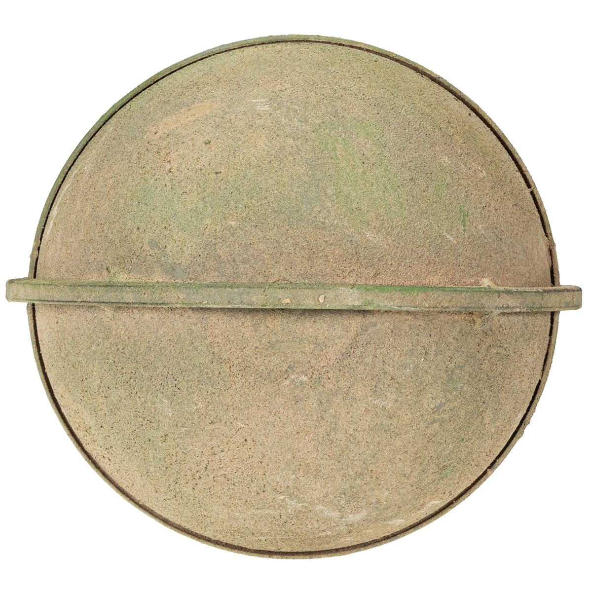 Die Blumenampel aus Metall besteht aus einer runden Schale, die von einem umlaufenden Bogen gehalten wird, der nach oben hin zusammenläuft.