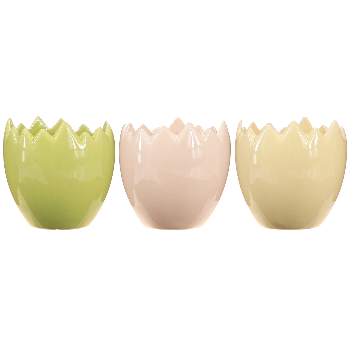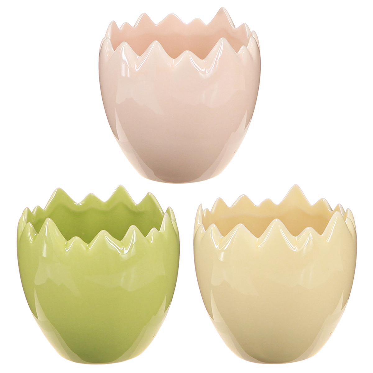 Die eierförmigen Blumentöpfe mit ihrer zerbrochen wirkenden Kante laden dazu ein, der Kreativität freien Lauf zu lassen. Gefertigt aus hochwertiger Keramik bringen sie nicht nur eine angenehme Haptik mit, sondern überzeugen auch mit ihrer Langlebigkeit. Mit einer Größe von 9 Zentimetern in der Höhe und einem Durchmesser von 8 Zentimetern passen sie perfekt für kleinere Pflanzen wie Sukkulenten, Kräuter oder Frühblüher. Die zarten Pastelltöne Gelb, Rosa und Grün wirken dezent und doch lebendig – ideal für Wohnstile wie Skandi, Boho oder modern-minimalistisch.