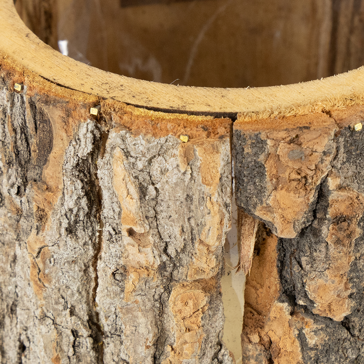 Der runde Topf besteht aus zusammengesetzten Stücken echter Baumrinde, was ihm diesen außergewöhnlichen Look gibt. Eine mit einer Patina aus Edelrost überzogene Vogelscheuche aus Metall steht am Rand des Gefäßes. Die Vogelscheuche lächelt fröhlich, während ein kleiner Vogel auf ihrem Arm sitzt.
