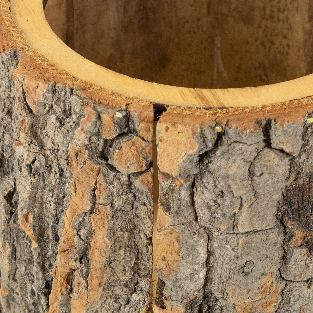 Durch die Öffnung lassen sich verschiedene Pflanzen einsetzen. Im Innenraum des Pflanzgefäßes ist ein Plastikeinsatz, der das Holz vor der Feuchtigkeit in Blumenerde schützt. Der Blumentopf dient wunderbar als Übertopf, insbesondere auch für künstliche Pflanzen und Seidenblumen.