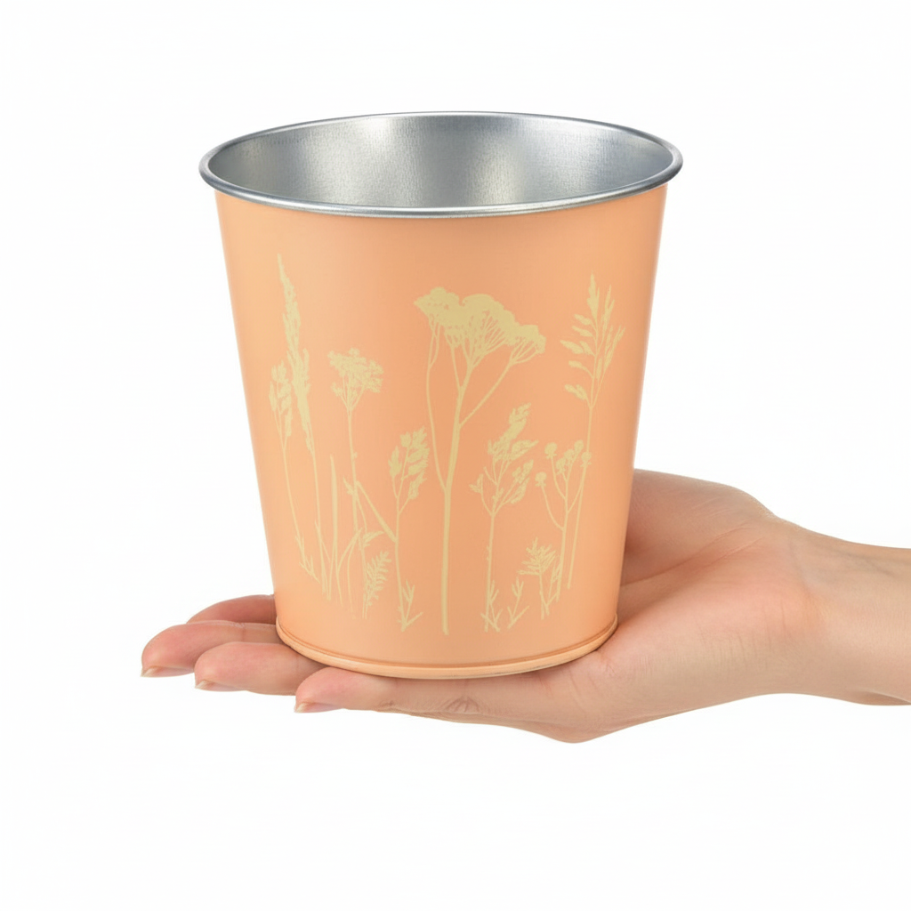 Sie erhalten den Übertopf aus Metall in der Farbe Pfirsich mit einseitig verziertem goldgelbem Motiv. Der Innenboden schimmert in Silber und lädt zum Bestücken und Bepflanzen ein.