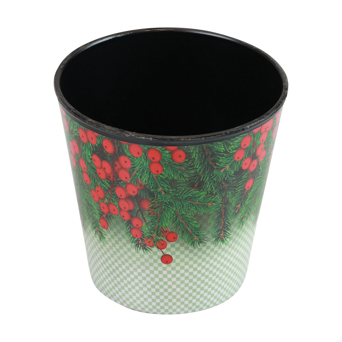 Der Blumentopf, aus robustem Kunststoff gefertigt, bietet eine Fülle von kreativen Gestaltungsmöglichkeiten, um weihnachtliche Gestecke in Rot und Grün zu kreieren. Er ist mit dem Motiv eines grünen Ilex-Zweigs, übersät mit roten Beeren, verziert. Nach unten hin geht die bedruckte Folie in ein charmantes grün-weißes Schachbrettmuster über. Die Innenseite des Übertopfs hingegen ist in Schwarz gehalten.