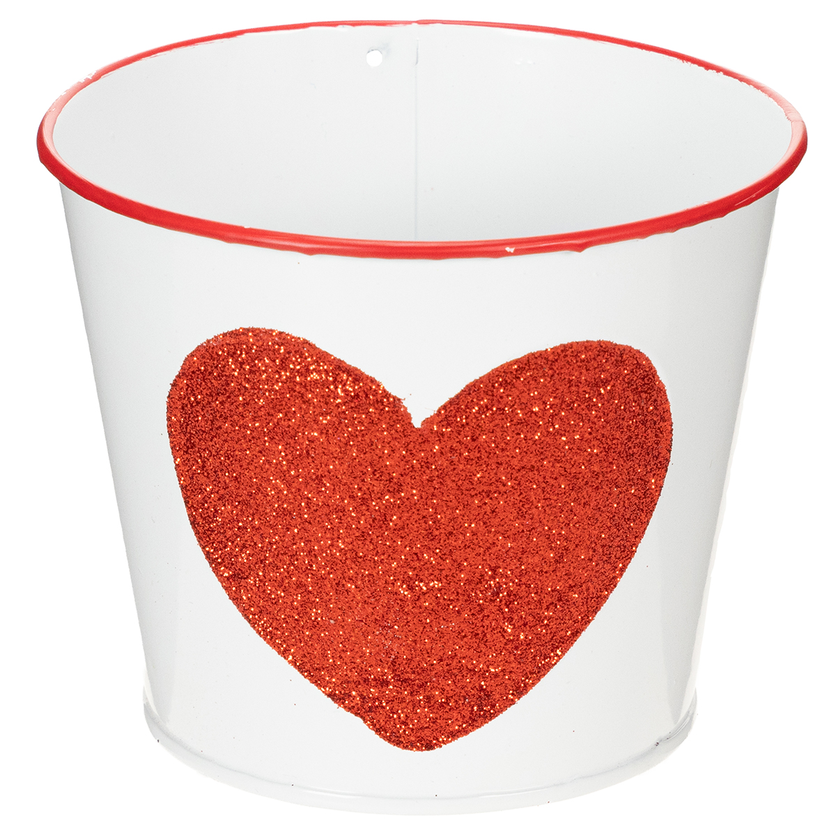 Das Herz ist in das Blech eingestanzt und wurde nachträglich mit rotem Glitter ausgefüllt. Der kleine Übertopf ist wie gemacht für kleine Kakteen oder Sukkulenten, bietet aber auch anderen Mini-Gewächsen wie Drachenbaum, Wunderstrauch, Josefsmantel oder Herzfarn einen schönen Platz zum Wachsen.