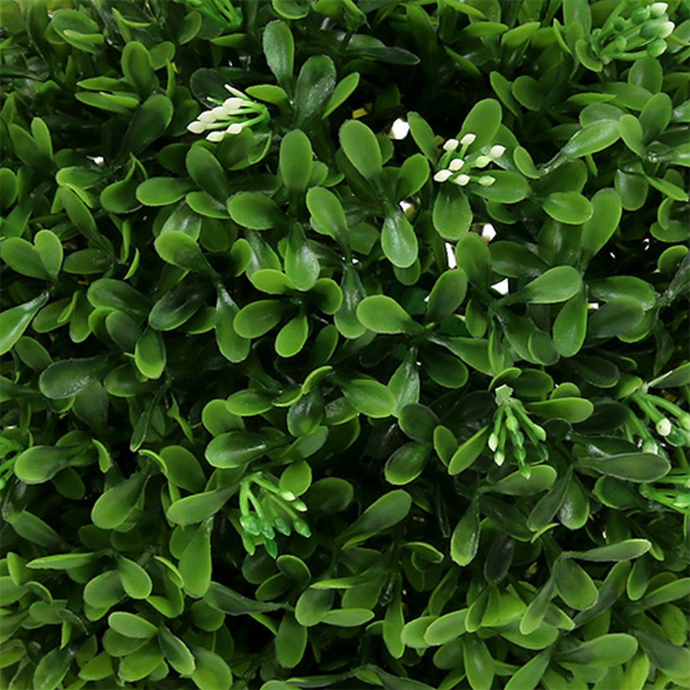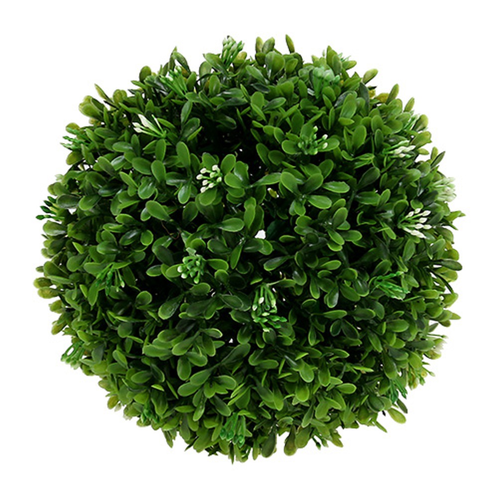 Die Kugel aus künstlichem Buchsbaum hat einen Durchmesser von etwa 18 Zentimetern und besteht aus hochwertigen, wetterfesten Kunststoff. Neben den saftig grünen Blättern der Kunstpflanze sind immer wieder kleine geschlossene weiße Blüten zu erkennen, die das Gesamtbild der Deko-Pflanze im wahrsten Sinne des Wortes abrunden.