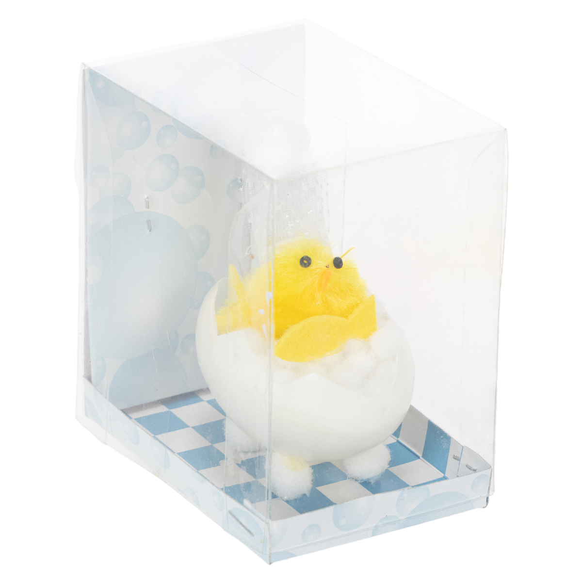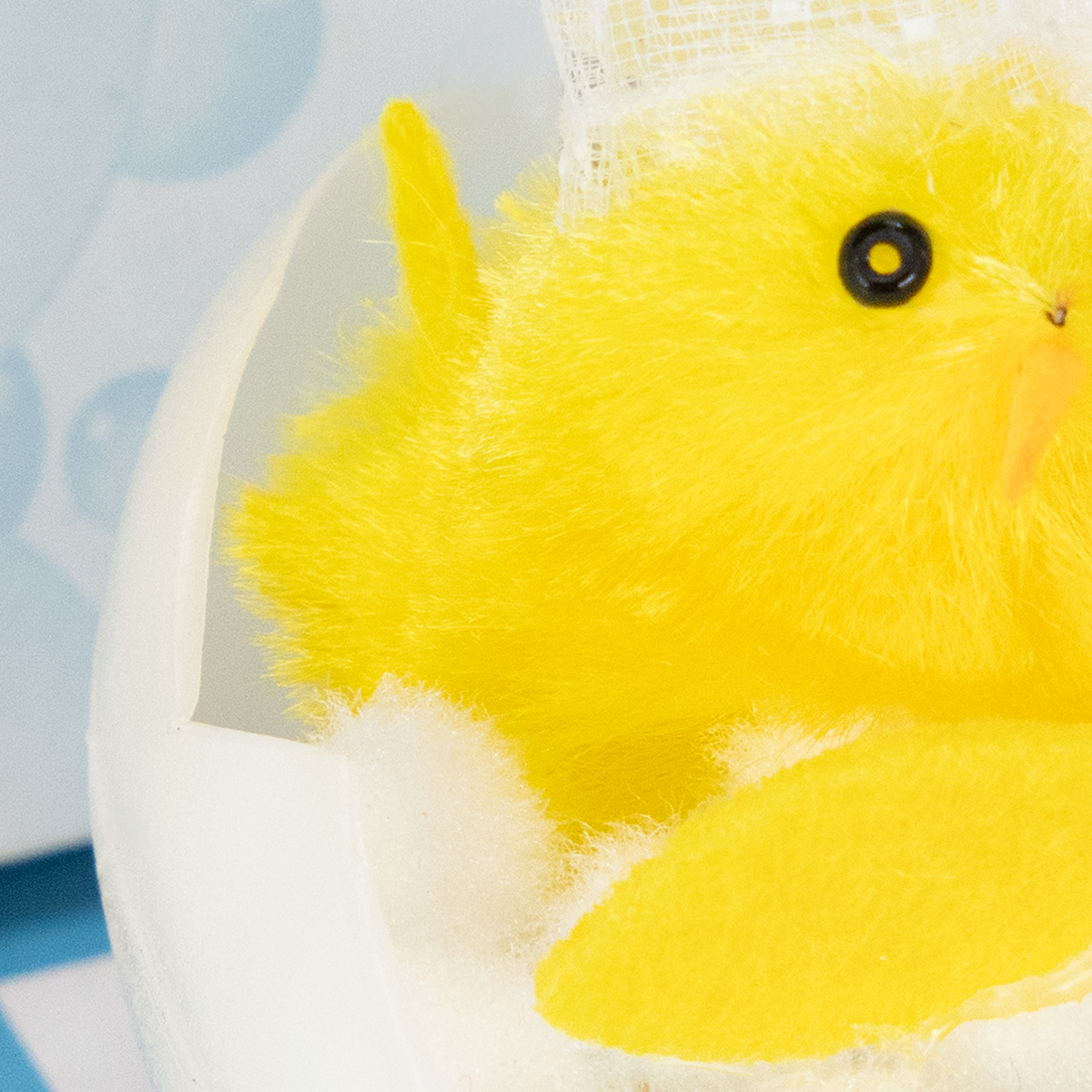 Osterküken in der Badewanne – na, wenn das mal keine ungewöhnliche und hübsche Osterdekoration ist! Dieses Chenilleküken in Gelb ist gerade beim Duschbad zu sehen und teilt sich den Badeschaum mit einem kleinen gelben Fisch. Die Badewanne des Kükens besteht aus einer aufgebrochenen Eierschale und steht mit vier Füßen aus Watte in einem blau-weiß gekachelten Pappaufsteller.