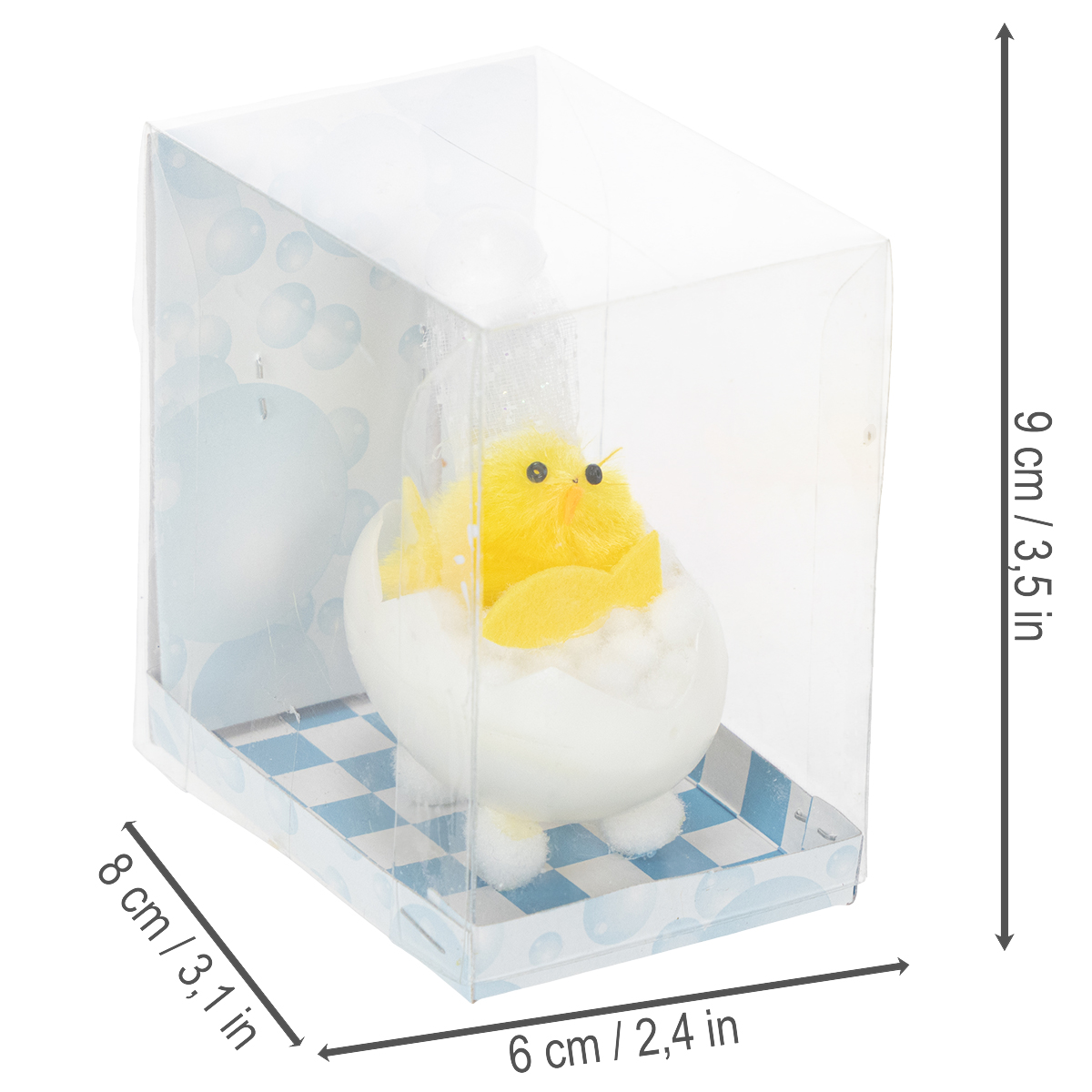 Das gelbe Chenilleküken im Bad ist mit dem Pappaufsteller und der Kunststoffbox circa 9 Zentimeter hoch. Die Badewanne, in der Schaum aus weißen Wattekügelchen schwimmt, hat eine Duschbrause, aus der Wasser, durch Organzastoff dargestellt, auf den Kopf der Figur zu spritzen scheint. Der Fisch, die gelben Flügel und der orange Schnabel bestehen aus Filz und runden mit den schwarzen Augen das entzückende Bild des badenden Osterkükens ab.