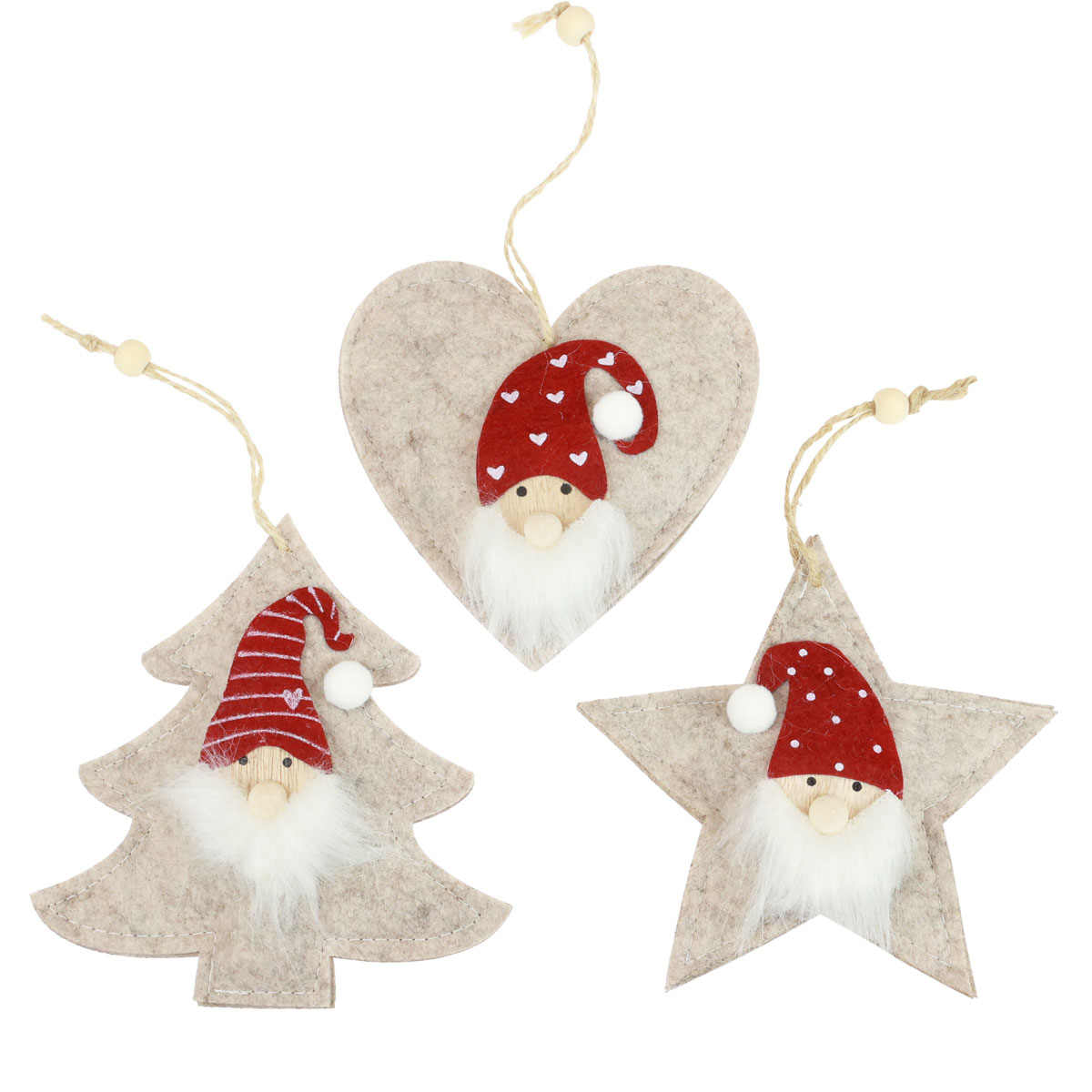 Der Weihnachtsbaumschmuck ist jeweils aus grau meliertem Filz gefertigt, der leicht gefüllt und damit etwas kissenartig gewölbt ist. Die Köpfe der weihnachtlichen Zwerge bestehen aus einem mit Augen bemalten Gesicht und einer Kugel für die Nase aus Holz.