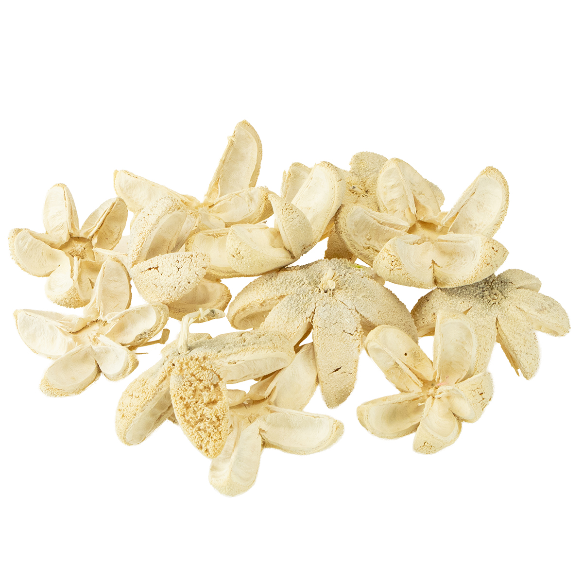 Die gebleichte Bullet Flower wird in einem Beutel zu insgesamt 12 Stück geliefert. Als Naturprodukt hat jede Trockenfrucht unterschiedliche Größen. So kann die Frucht zwischen circa 3 und 6 Zentimeter lang sein und einen Durchmesser von circa 3,5 bis etwa 7 Zentimeter besitzen.