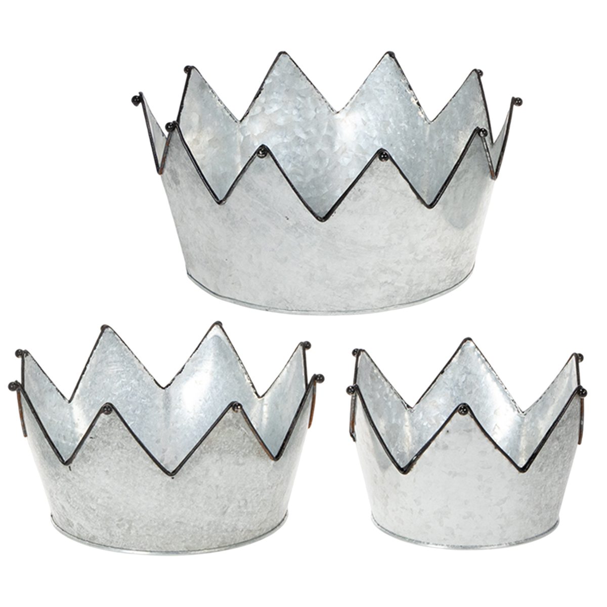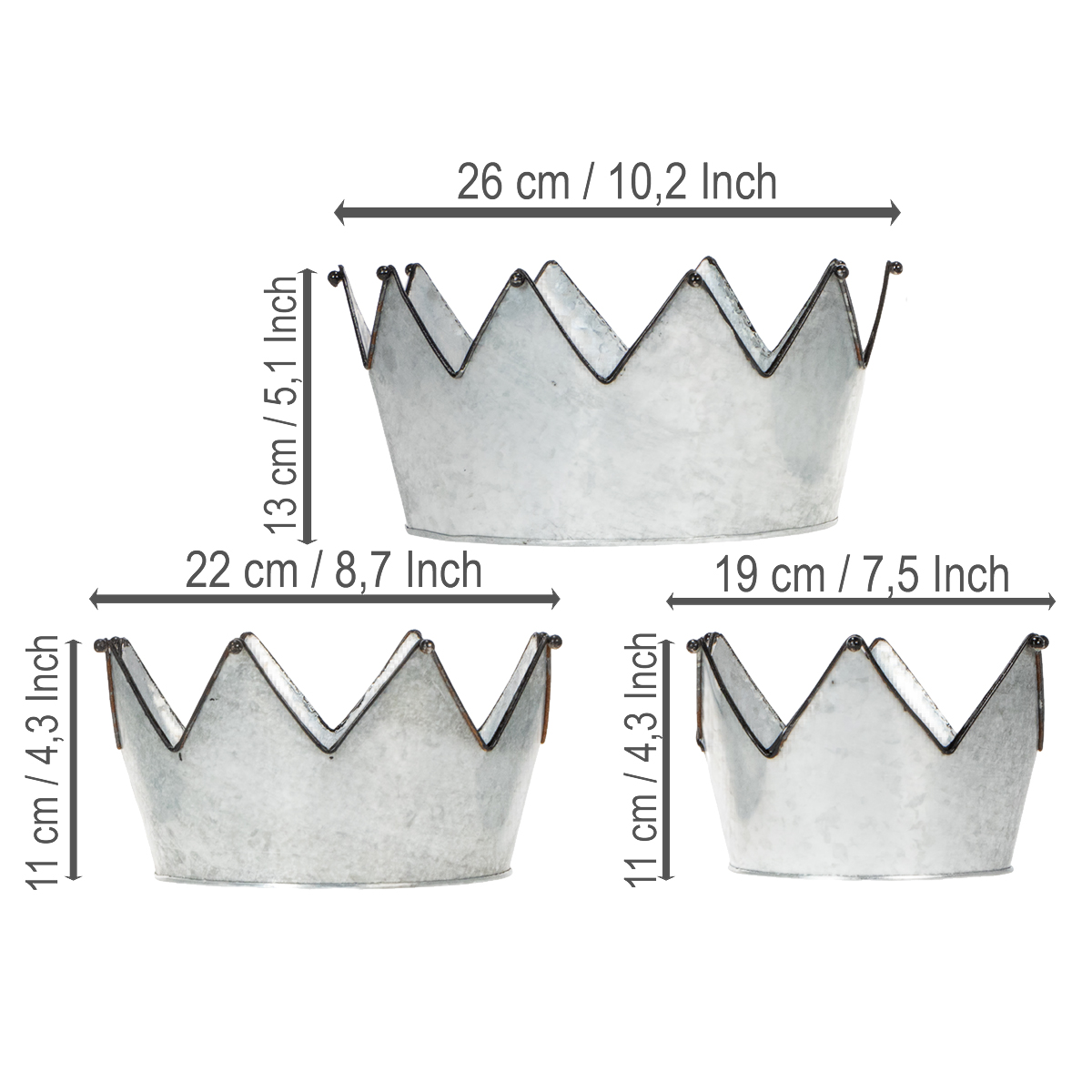 Die drei Metallschalen aus Zink sind in unterschiedlicher Größe gefertigt. Gemeinsam haben sie den schwarzen Rand um die Zacken, die von einer kleinen Zierkugel geschmückt sind. Passend zur Vintage-Deko ist auch die Kugel in Schwarz gehalten. Der schwarze Rand mit Verzierung macht jedem klar: Hier stehen drei Kronen – fertig zum Befüllen oder einfach zum Hinstellen.