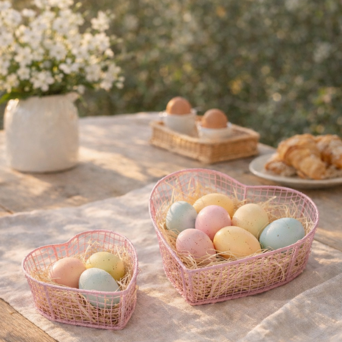 Schaffen Sie eine romantische, zugleich gut organisierte Atmosphäre mit den wunderschönen Drahtkörben in Herzform. Ob als dekoratives Highlight auf dem Tisch, zur Aufbewahrung kleiner Gegenstände oder als stilvolles Geschenkset – diese herzförmigen Metallkörbe bringen Liebe und Ordnung in Ihr Zuhause. Die Körbe bestehen aus stabilem Metall und kommen in den sanften Farben Rosa und Lila. Sie eignen sich perfekt für den Einsatz im Wohnbereich oder im geschützten Außenbereich und sind die ideale Wahl für eine romantische Tischdekoration bei besonderen Anlässen wie Hochzeiten, Valentinstag oder Geburtstagen.