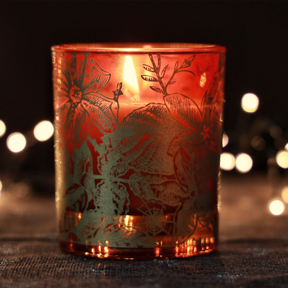 Passend dazu ist das Glas der Duftkerze in ein schönes Weihnachtsrot getaucht. Um das dicke Glas herum ranken sich goldene Blumen.