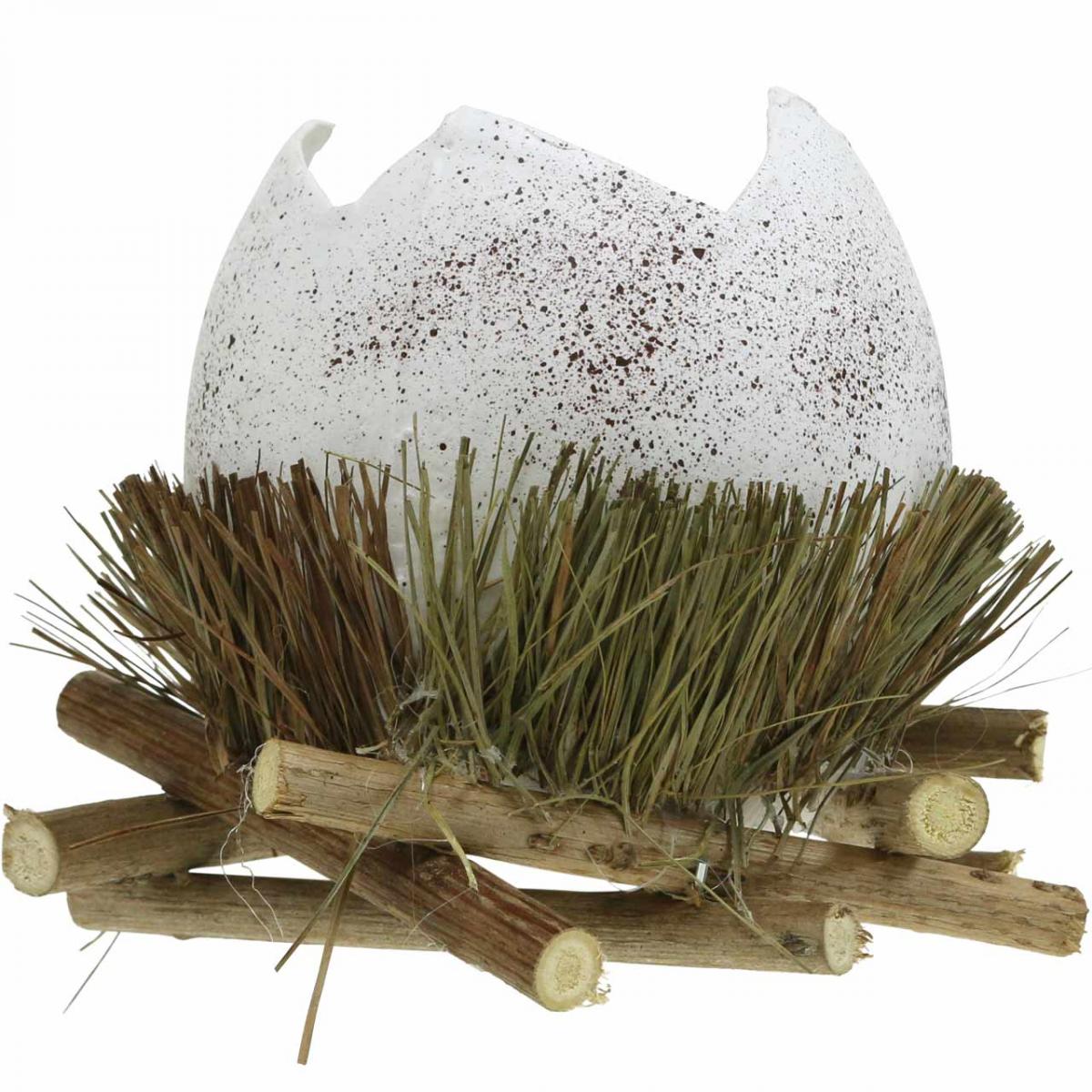 Das weiße Ei im Nest besitzt einen Durchmesser von circa 9 Zentimetern und ist in etwa 10 Zentimeter hoch. Probieren Sie auch mal eine entzückende Schaufensterdekoration für Ihren Spielzeugwarenladen, Ihr Restaurant oder Ihren Verkaufsraum mit diesem Osterei zu gestalten – Ihre Kunden und Gäste werden sich freuen!