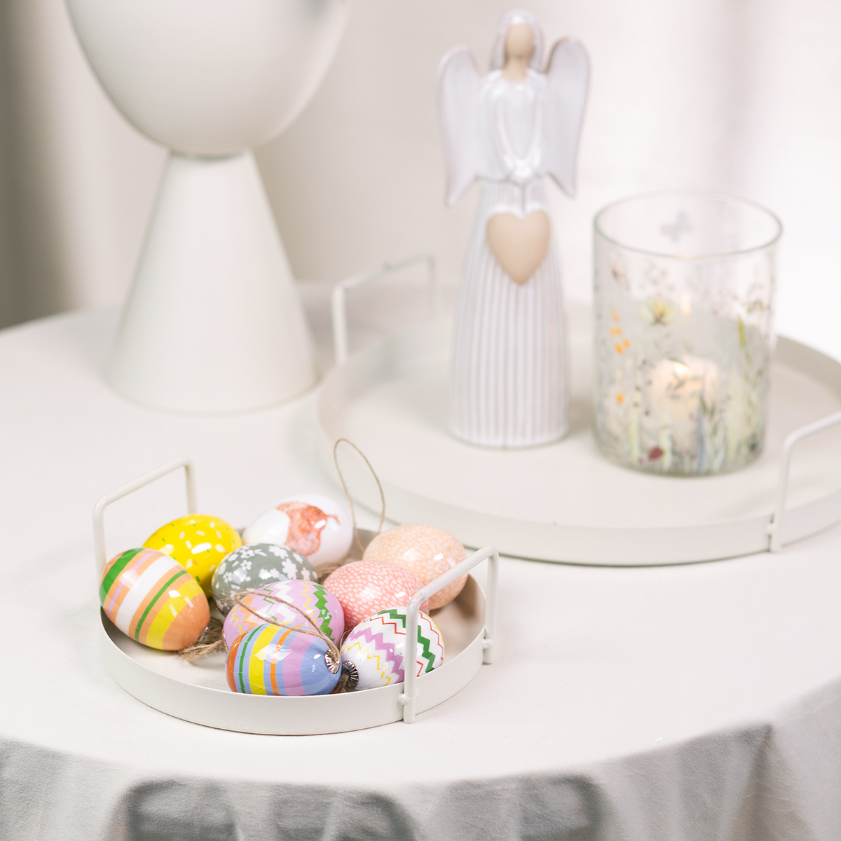 - Erstelle deine eigene Tischdeko, indem du die Ostereier mit Kerzen und frischen Blüten arrangierst.
