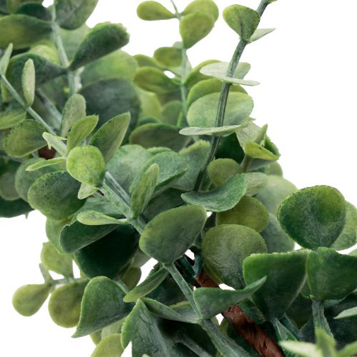 Die Eukalyptus-Girlande in Grün besteht aus Kunststoff und weist für größere Flexibilität einen Drahtkern aus Metall auf. Die Länge der Deko-Girlande beträgt etwa 150 Zentimeter. Die vielen kleinen Blätter sind etwa 1 bis 2 Zentimeter groß.