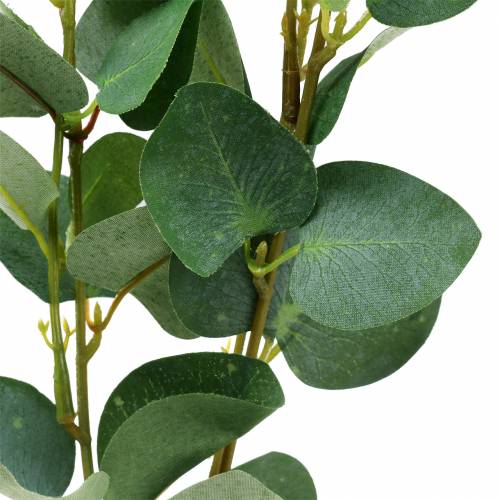 Der künstliche Zweig des Eukalyptus ist ungefähr 76 Zentimeter groß. Es befinden sich circa 52 Blätter in der Farbe grau-grün mit der typischen Eukalyptus-Blatt-Form aus hochwertigem Textilmaterial daran.