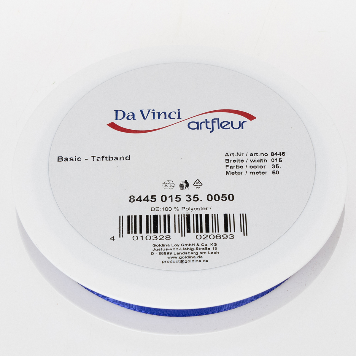 Das hübsche Geschenk- und Dekorationsband in Dunkelblau ist etwa 15 Millimeter breit und ungefähr 50 Meter lang. Es besteht zu 100% aus Polyester und kommt auf einer handlichen, flachen Kunststoff-Spule zu Ihnen.