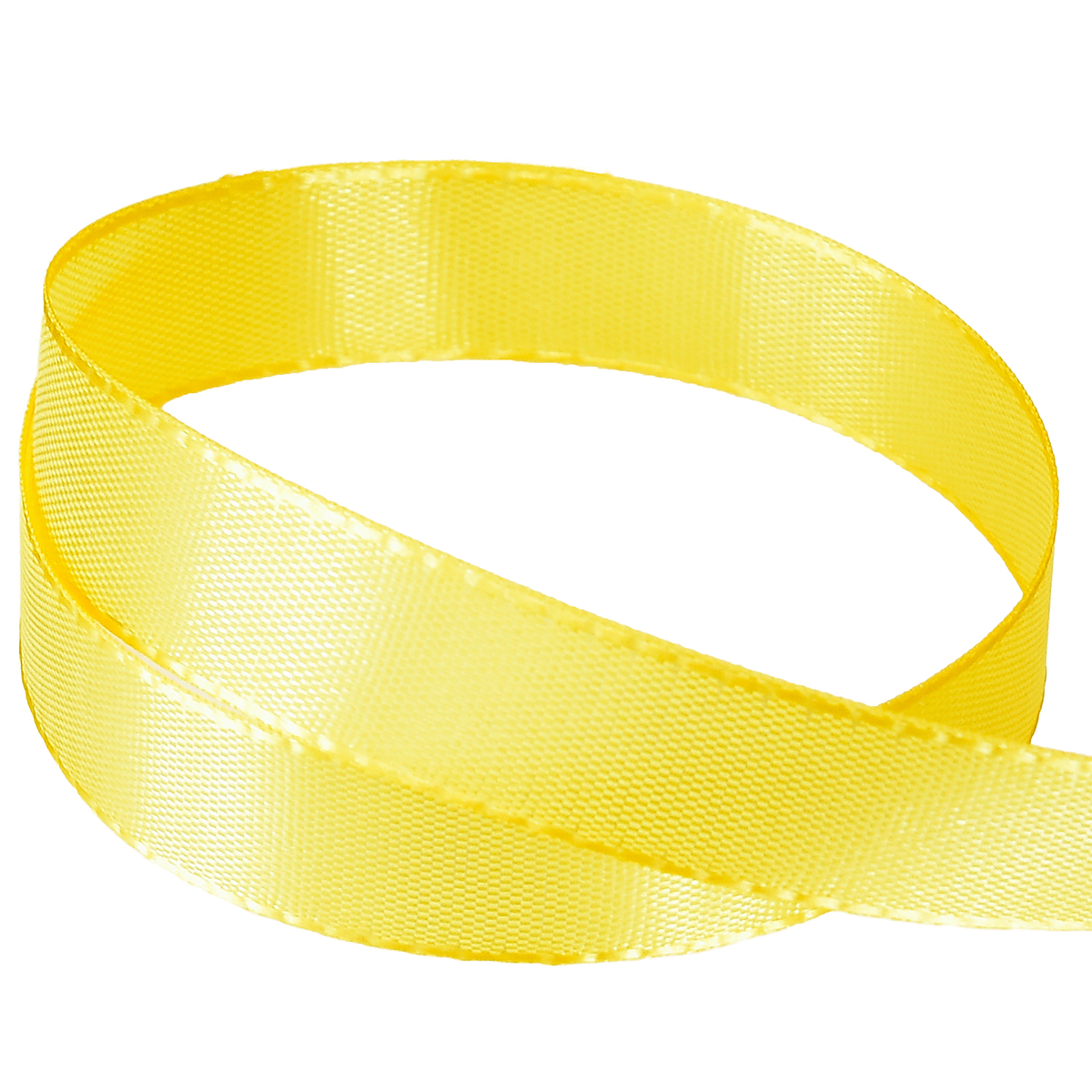 Das gelbe Geschenk- und Dekorationsband aus 100% Polyamid ist ungefähr 15 Millimeter breit und etwa 50 Meter lang. Es ist auf einer handlichen Kunststoff-Spule aufgewickelt.