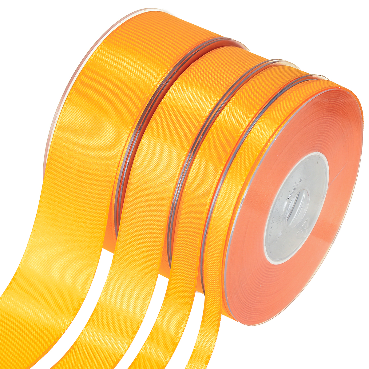 Das Geschenk- und Dekorationsband in Orange ist jeweils auf eine Kunststoffrolle gewickelt. Jede Variante hat eine Länge von circa 50 Metern.