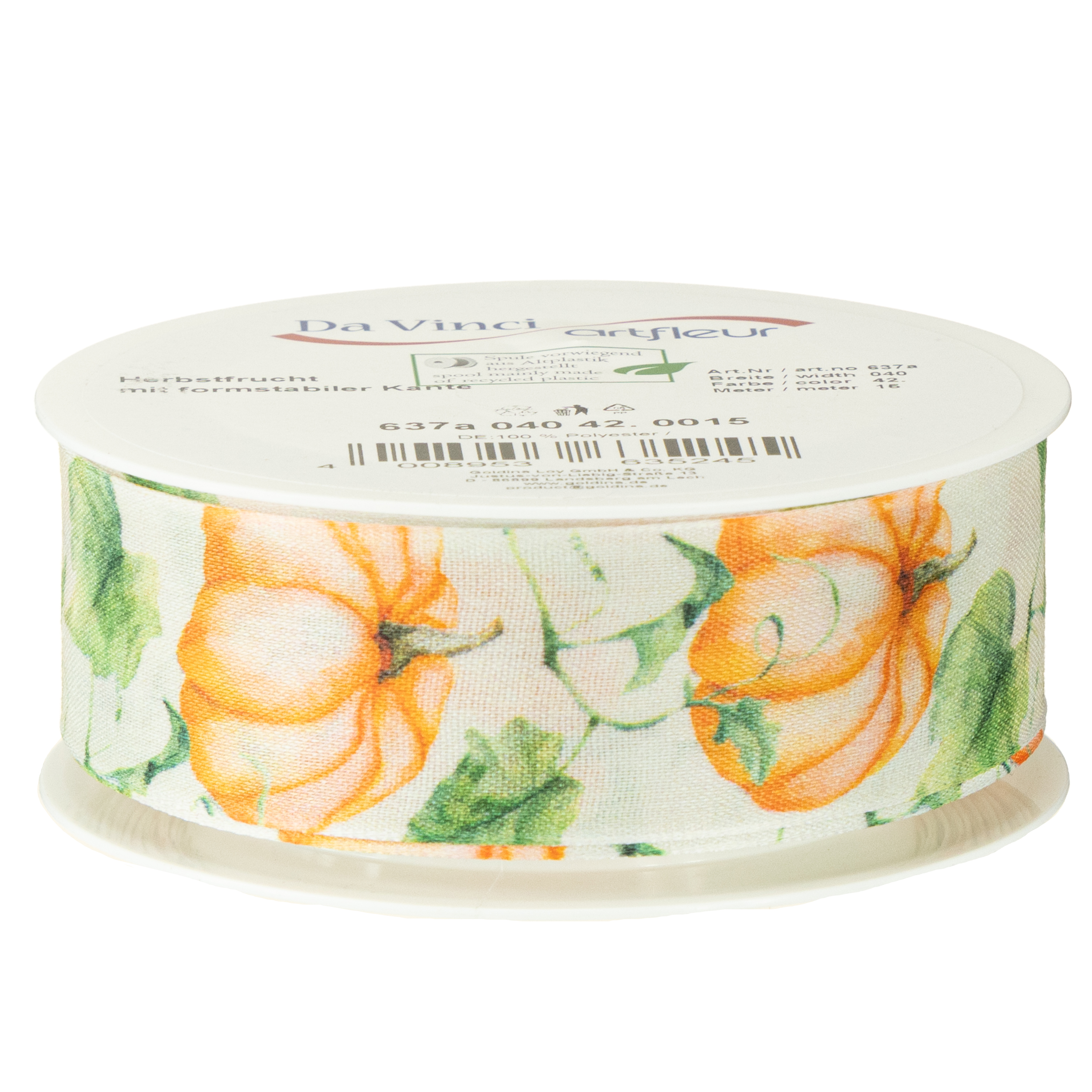 Sie erhalten das Geschenkband mit dem schönen Kürbismotiv auf einer Spule aus recyceltem Kunststoff. Mit diesem Muster finden Sie das Band zusätzlich in unserem Shop auch in Hellgrün.