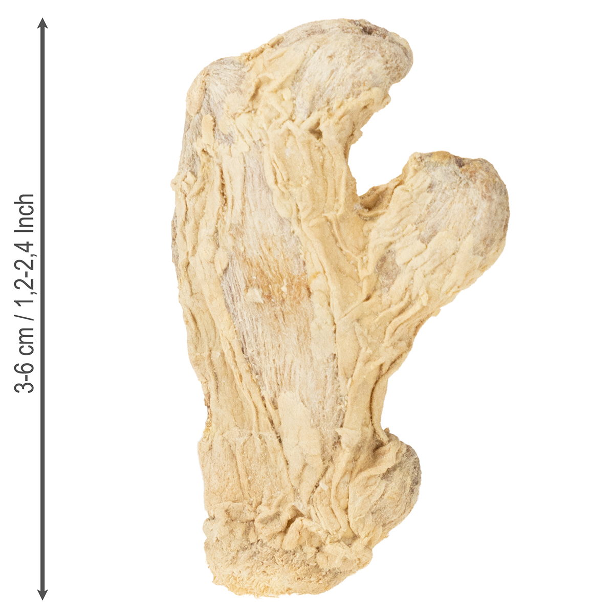 Der getrocknete Ingwer wird zu 500 Gramm in einem Beutel geliefert. Die Größe der einzelnen Stücke variiert und kann circa zwischen 3 und 6 Zentimeter liegen.