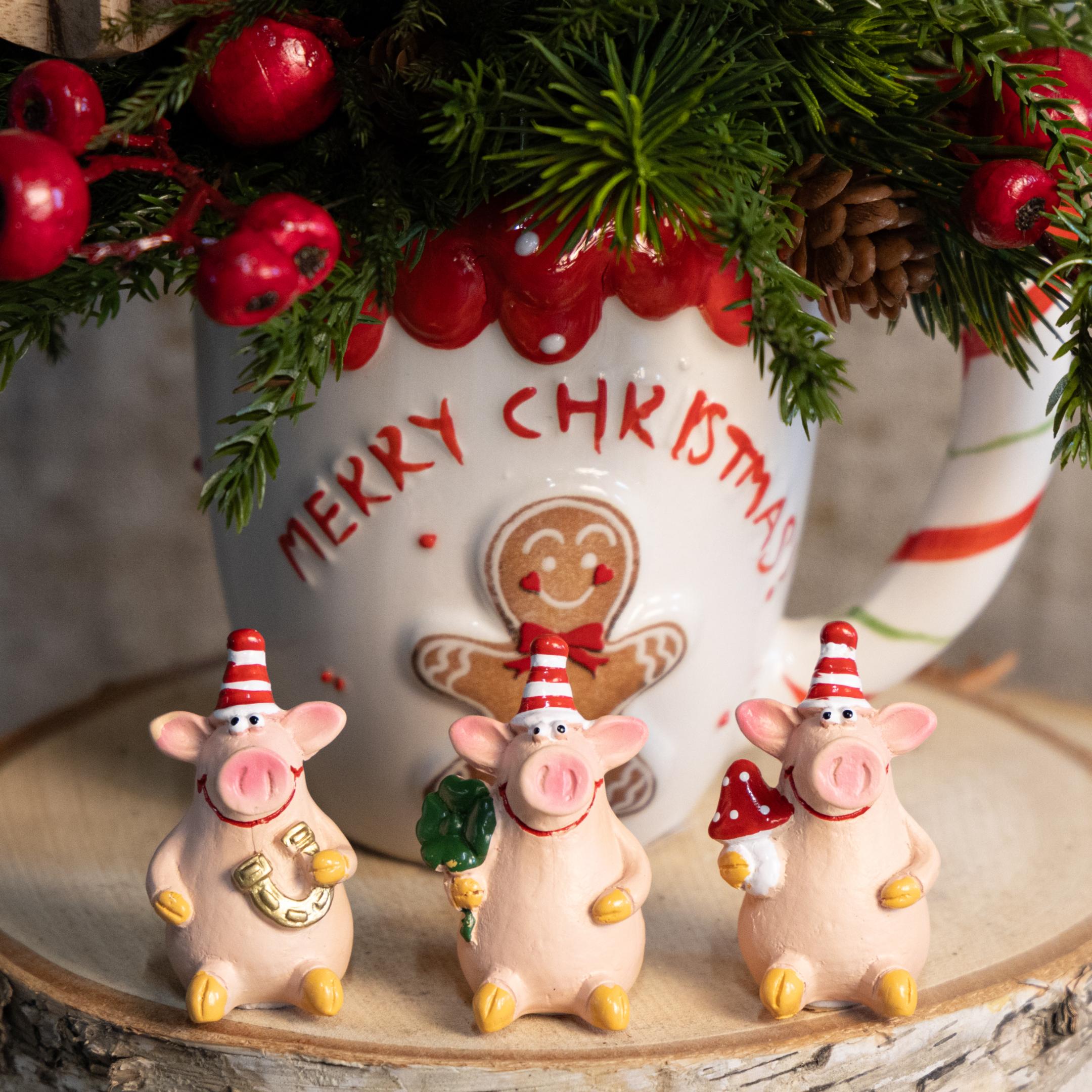 Das Glücksschwein mit Glücksbringern begeistert auf den ersten Blick. Die Mini-Schweinchen, jedes etwa 5 cm groß, sind detailreich und liebevoll von Hand bemalt – eine wahre Augenweide! Die Deko-Schweine als sitzende Figuren kommen gleich im Set, bestehend aus sechs verschiedenen Glücksbringern, daher. Ob mit einem Kleeblatt, einem Glückspilz oder einem Hufeisen, jedes Schweinchen trägt stolz einen anderen traditionellen Glücksbringer. Gestreifte Hütchen auf den Schweinchen machen sie besonders festlich – perfekt für die Silvesterparty! Ein kleiner Klebepunkt auf der Unterseite sorgt dafür, dass sie sicher an ihrem Platz bleiben und nicht so leicht wegrutschen. Einfach toll in Kombination mit weiteren festlichen Accessoires von Floristik24 – wie wäre es mit glanzvollen Kerzenhaltern oder strahlenden Lichterketten?