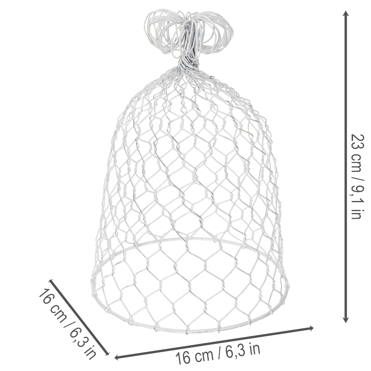 Aus stabilem Metall gefertigt, strahlt die Glocke eine zeitlose Eleganz aus, die perfekt zu rustikalen und ländlichen Einrichtungskonzepten passt. Mit einer Höhe von 23 cm und einem Durchmesser von 16 cm bietet sie ausreichend Platz für individuelle Dekorationsideen. Das weiße Finish unterstreicht den Vintage-Charakter und harmoniert wunderbar mit natürlichen Materialien wie Holz, Keramik oder Trockenblumen. Ob im Wohnzimmer, auf der gedeckten Terrasse oder als charmantes Detail bei Hochzeiten – diese Drahtglocke inspiriert zu kreativen und einzigartigen Gestaltungsmöglichkeiten.