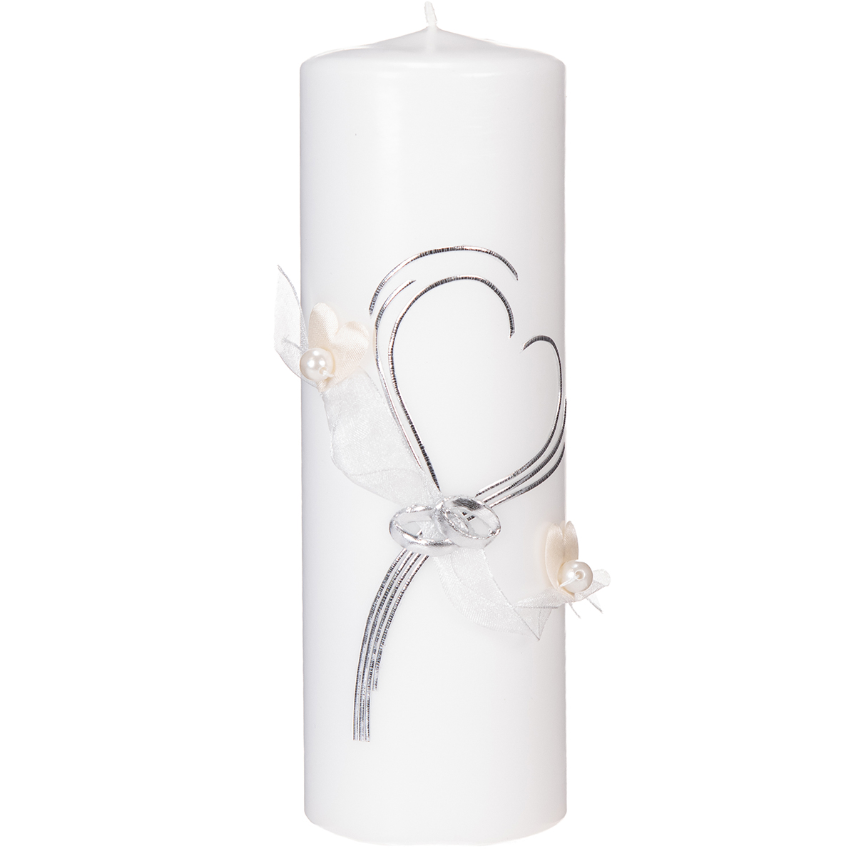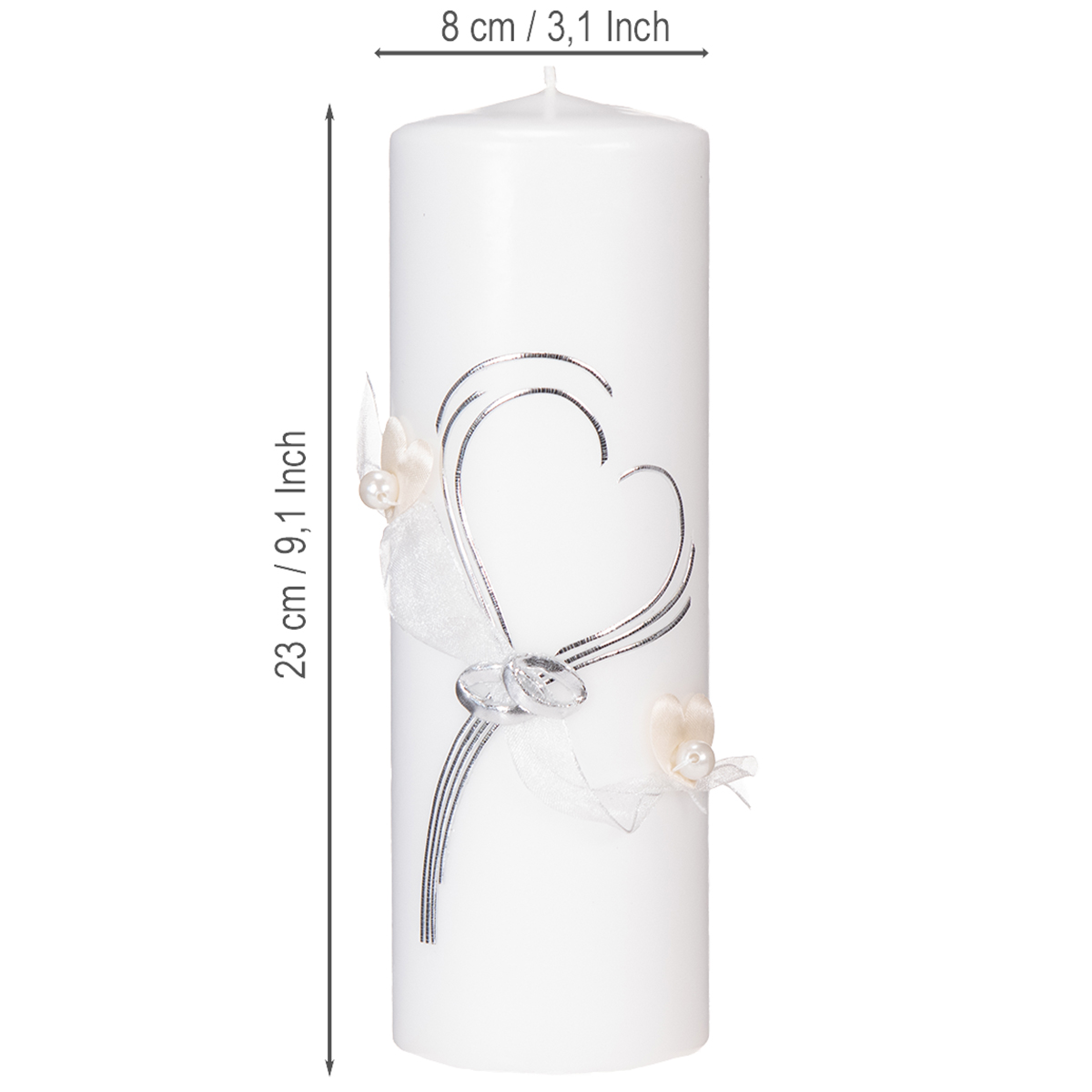 Produktname: Festliche Hochzeitskerze mit stilvollem Herz-Design, Silberverzierungen und Organza-Band – Ideal für Hochzeit und Silberhochzeit, 230/80mm