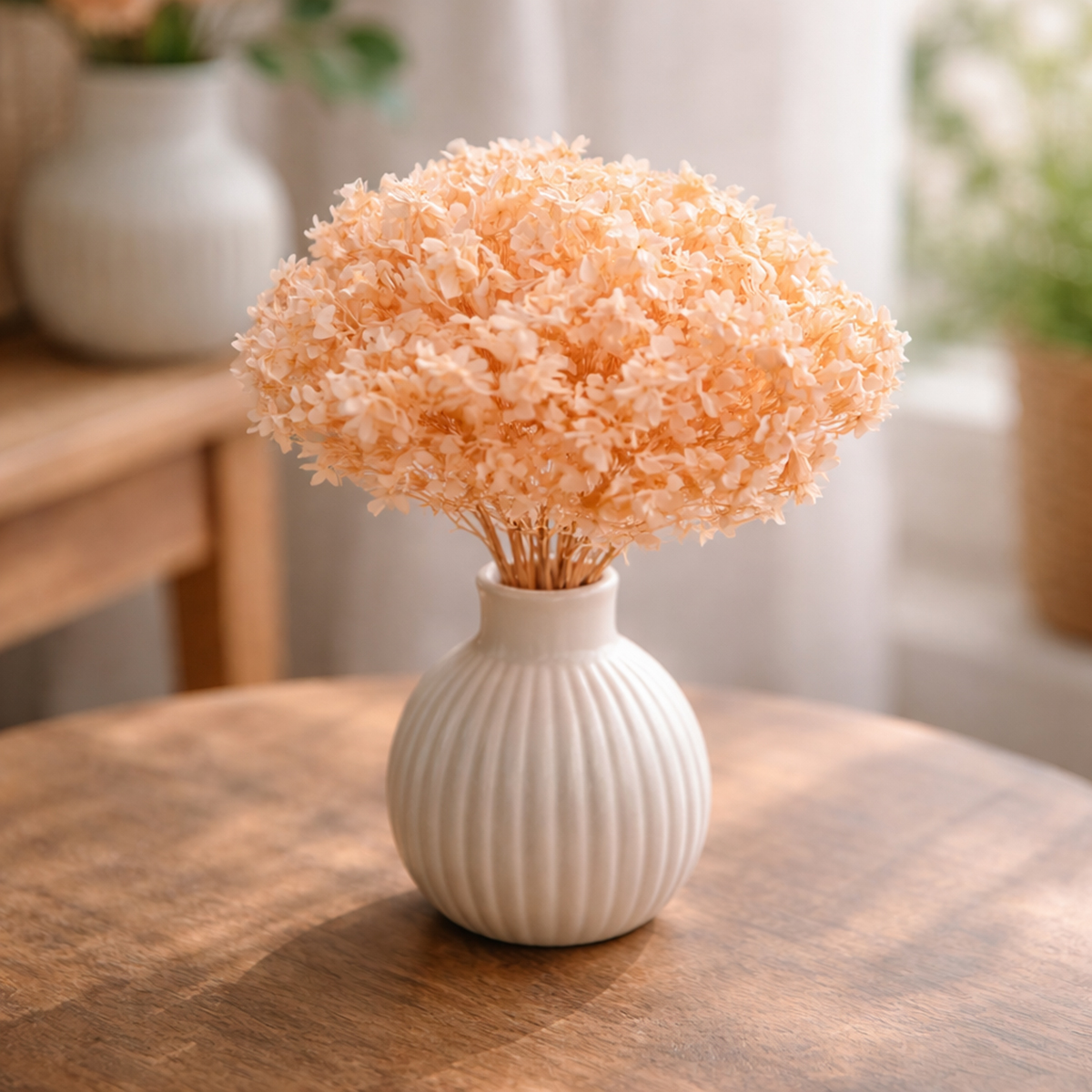 Unsere getrocknete Hortensie passt perfekt in jedes Ambiente, ob modern, skandinavisch oder im romantischen Landhausstil. Die großen Hortensienblüten in Hellorange verleihen Ihrer Dekoration einen sanften, warmen Charakter und ziehen alle Blicke auf sich. Platzieren Sie den Strauß in einer schlichten Vase, um seine natürliche Schönheit hervorzuheben, oder kombinieren Sie ihn mit anderen Trockenblumen für ein opulenteres Arrangement. Besonders geeignet ist er für Wohnzimmer- und Esszimmerdekoration, aber auch für Hochzeits- und Eventdesigns. Schon ein einzelnes Exemplar reicht aus, um einen Raum mit floraler Eleganz zu füllen.