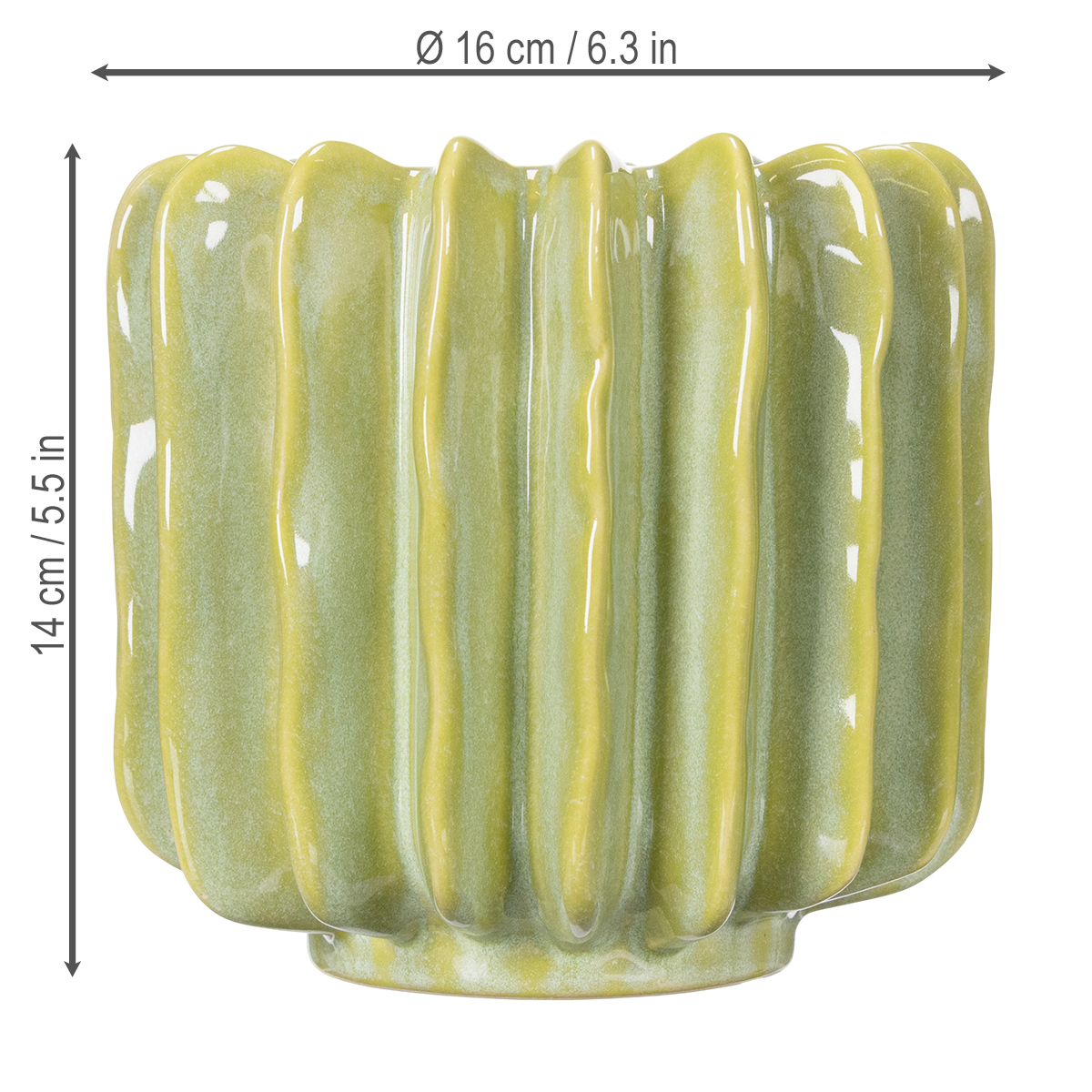 Was für ein Blickfang! Dieser grüne Kaktus-Blumentopf ist nicht nur hübsch anzusehen, sondern bringt auch eine frische, exotische Note in Ihr Zuhause. Ganz gleich, ob Sie ein Fan von Kakteen sind oder einfach ein Faible für stilvolle Wohnakzente haben – dieses dekorative Stück wird Sie begeistern. Die harmonische grüne Farbe, kombiniert mit dem außergewöhnlichen Design und den markanten Rillen, verleiht Ihrem Interieur eine besondere Ausstrahlung. Stellen Sie sich vor, wie attraktiv dieser 16 cm große Keramik-Pflanztopf auf Ihrer Fensterbank, auf dem Wohnzimmerregal oder sogar auf Ihrem Schreibtisch wirkt. Er verbindet Stil und Funktionalität auf ideale Weise.