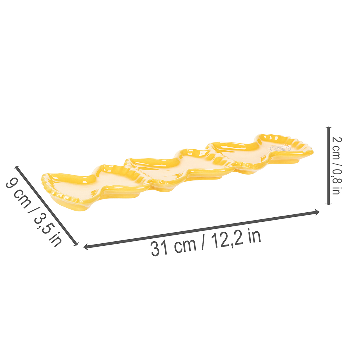 Mit einer Länge von 31 cm und einer Breite von 9 cm bietet diese Keramikdipschale Platz genug für Ihre liebsten kleinen Häppchen. Die verspielte Pasta-Form der Schale verleiht ihr einen charmanten Charakter und macht sie zu einem Blickfang bei jeder Tischdekoration. Kombiniert mit anderen gelben Accessoires wie den Pasta-Vasen aus unserem Sortiment wird Ihre Tafel zu einem harmonischen Gesamtkunstwerk, das sich hervorragend für einen mediterranen oder sommerlichen Stil eignet.