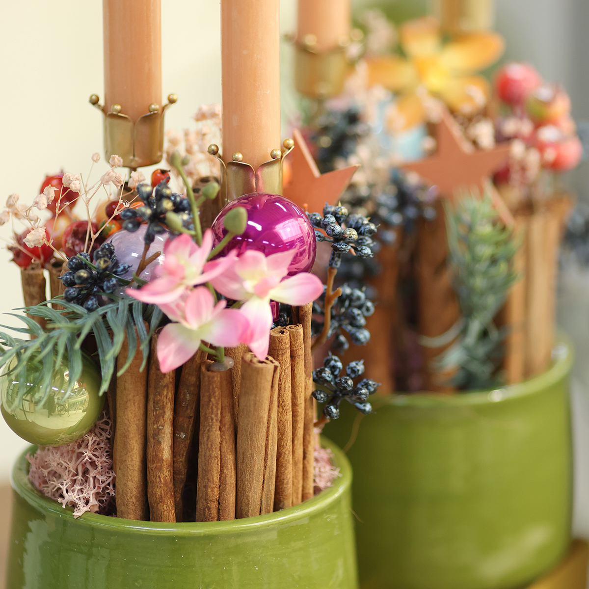Verwendungszweck: Dekorationsartikel für die Weihnachtszeit und Silvester, inklusive Tischschmuck, Kränze, Figuren, Gestecke, Anhänger und floristische Arrangements.