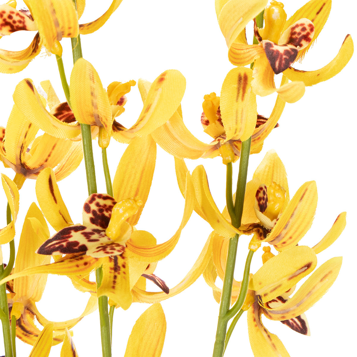 Die Cymbidium Orchidee gilt als Symbol für Eleganz und Raffinesse. Dank ihrer hochwertigen Verarbeitung ist sie nahezu unverwüstlich und doch ein echter Hingucker. Die Kombination aus gelbem Seidenstoff, der authentische Haptik vermittelt, und einem flexiblen Kunststoffstiel macht sie nicht nur visuell ansprechend, sondern auch praktisch für Ihre Kreativprojekte. Dekorieren Sie damit große Vasen oder kombinieren Sie die Orchidee für eindrucksvolle Arrangements mit grünen Zweigen und anderen künstlichen Blumen.