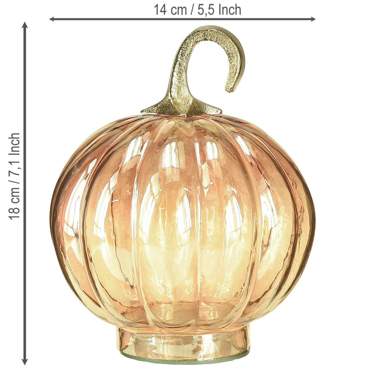 Die Glasdeko ist klar, jedoch in hellem Orange getönt. Im Licht schimmert der Dekokürbis zusätzlich mit einem leichten Perlmutteffekt und glänzt dabei wunderschön. Ein malerisch geformter Stiel aus Metall macht die Kürbis-Deko perfekt. Wenn Sie ihn sicher befestigen, können Sie den Glaskürbis am Stiel sogar aufhängen!