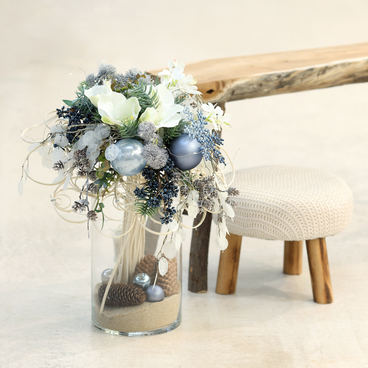 Verwendungszweck: Dekorationsartikel für die Weihnachtszeit und Silvester, inklusive Tischschmuck, Kränze, Figuren, Gestecke, Anhänger und floristische Arrangements.