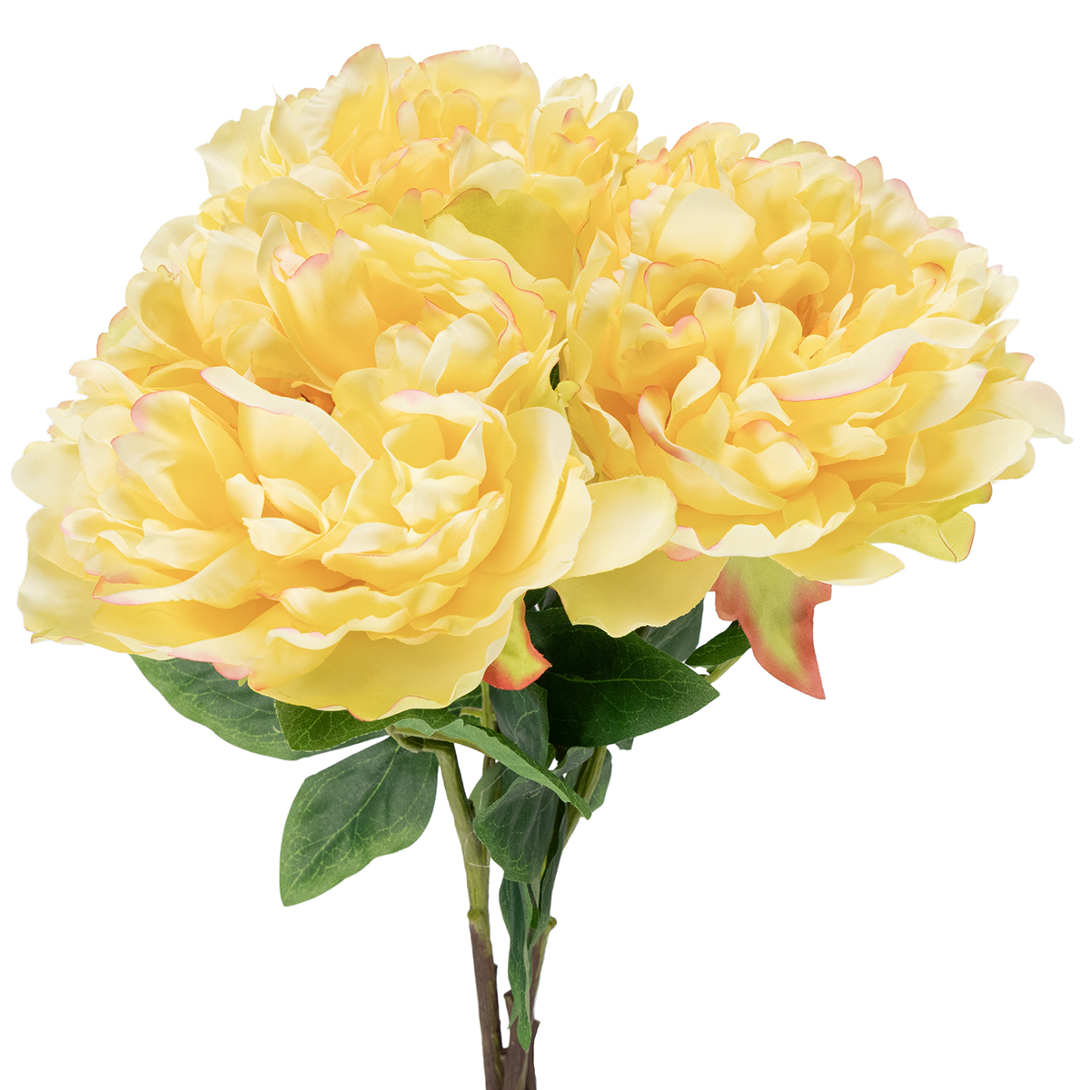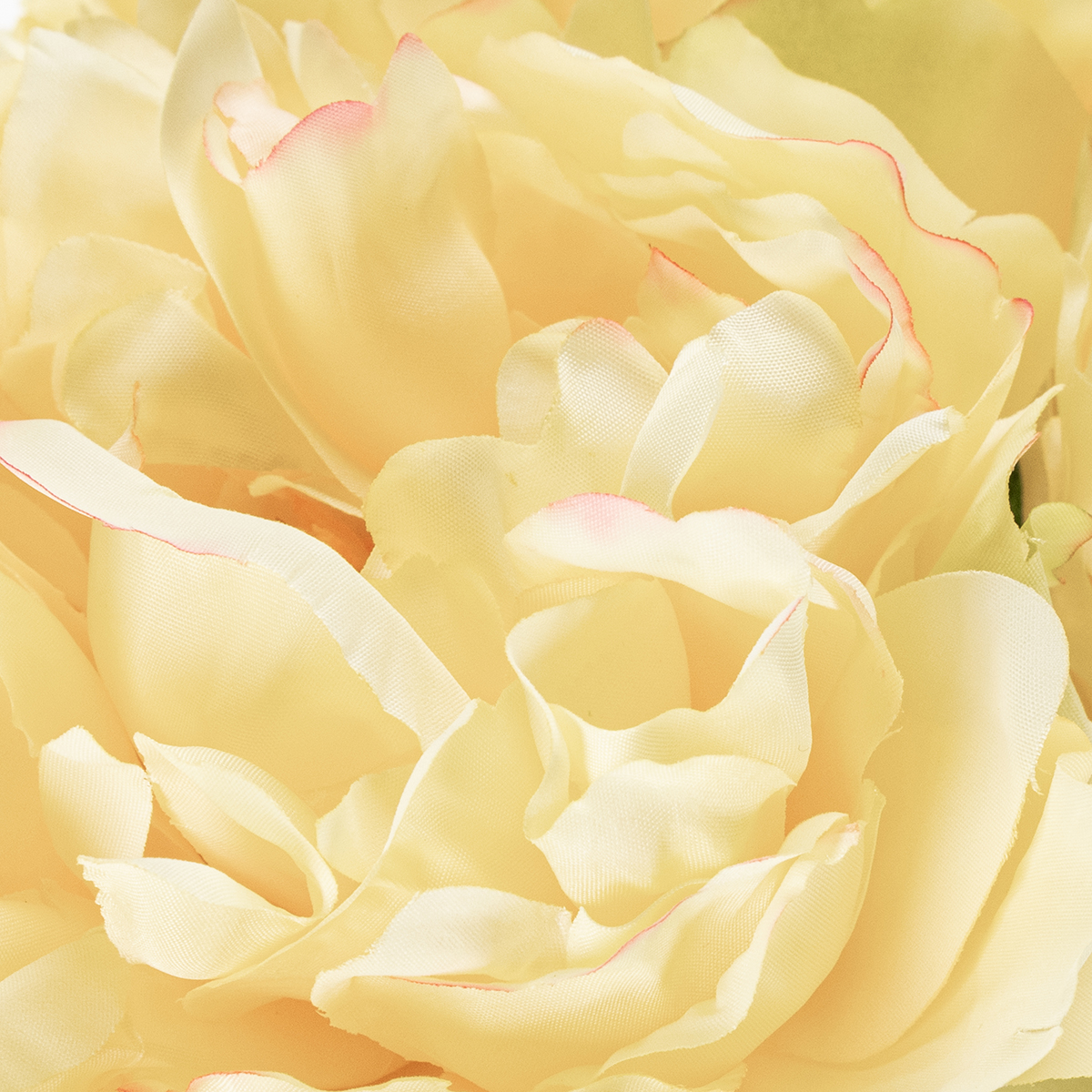Unsere Kunst Pfingstrosen sind ein echtes Highlight für jeden Einrichtungsstil. Die sanfte Gelbfärbung der Blüten wirkt freundlich und einladend und passt dadurch wunderbar in ein modernes, skandinavisches oder auch klassisches Ambiente. Dank des hochwertigen Seidenstoffmaterials sehen die Blüten täuschend echt aus. Ideal für alle, die natürliche Blumen lieben, jedoch auf ständiges Gießen und Welken verzichten möchten. Diese Blumen sind langlebig, pflegeleicht und bleiben auch nach Jahren in ihrer ursprünglichen Schönheit erhalten.