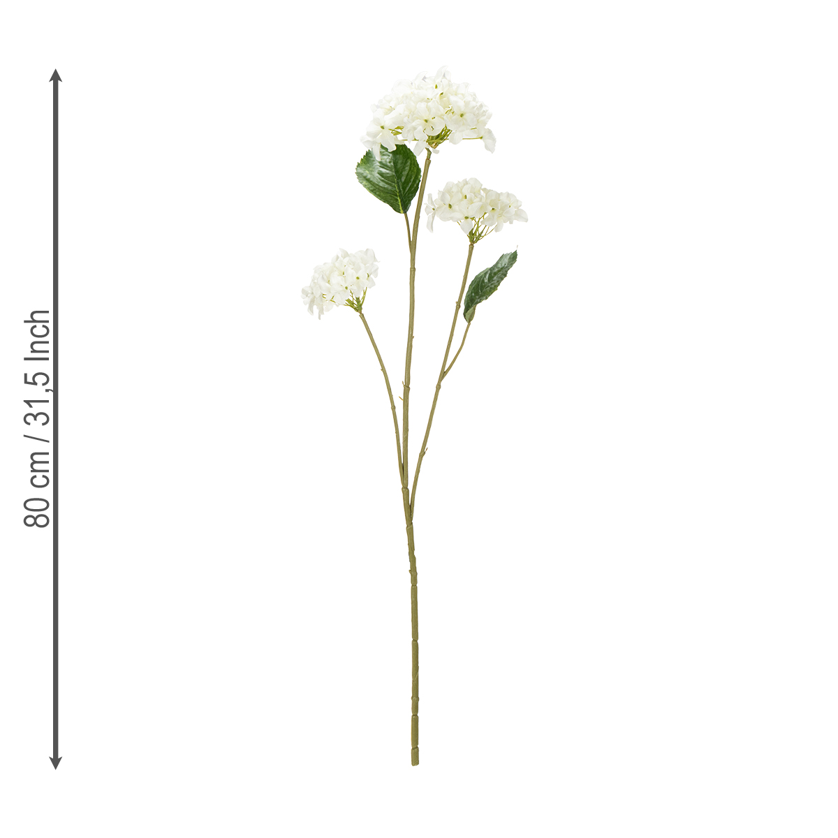 Haben Sie sich jemals gefragt, wie Sie Ihrem Zuhause mit minimalem Aufwand eine elegante und zeitlose Note verleihen können? Dann könnten künstliche Hortensien genau das Richtige für Sie sein! Die weiße Kunstblume besticht durch ihre täuschend echte Optik und ihre Vielseitigkeit. Ob als Highlight in modernen Wohnräumen, als Teil eines stilvollen Tischarrangements oder als beeindruckender Akzent in Empfangsbereichen – diese langlebige, dekorative Blume fügt sich perfekt in jede Umgebung ein. Auf einem filigranen Zweig befinden sich drei üppige Blüten und zwei grüne Blätter, die das Arrangement besonders natürlich wirken lassen. Mit einer Höhe von 80 cm und einer Breite von 30 cm ist sie ideal für größere Vasen oder dekorative Bodenarrangements geeignet. Die hochwertige Verarbeitung aus Polyester und Kunststoff sorgt dafür, dass Sie lange Freude an dieser eleganten Kunstblume haben werden.