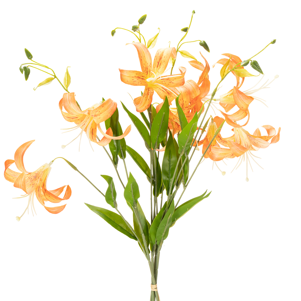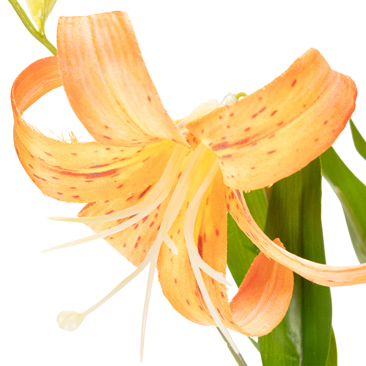 Warum künstliche Lilien? Ganz einfach: Sie sparen sich die Mühe der Pflege und genießen trotzdem das Aussehen einer frisch arrangierten Dekoration. Mit ihren leuchtend orangefarbenen Blüten machen diese Lilien in jeder Umgebung eine fantastische Figur. Die Kombination aus Polyester und Kunststoff sorgt für den naturgetreuen Effekt, während die flexiblen Stiele eine einfache Anpassung und Positionierung erlauben. Stellen Sie sie in hohe Vasen für einen eleganten Empfangsbereich oder legen Sie sie fließend auf einem Tisch aus – sie passen sich jeder Stilrichtung an, ob klassisch, modern oder Boho. Besonders beliebt sind diese Kunstblumen als Hochzeitsdeko: Stimmungsvolle Arrangements für die Zeremonie, zauberhafte Tafelverzierungen oder beeindruckende Eingangsdekorationen sind im Handumdrehen geschaffen. Und als zusätzlicher Vorteil: Die Blüten halten nicht nur für den besonderen Tag, sondern bleiben Ihnen noch lange als schöne Erinnerung erhalten. Sie planen ein Event und benötigen florale Hingucker? Ob großformatige Designs oder detailreiche Tischarrangements, diese Lilien sind genau das Richtige. Ergänzen Sie die Pracht durch passende Accessoires, wie zarte Schleifen, künstliche Gräser oder Kerzenhalter – Ihrer Kreativität sind keine Grenzen gesetzt.