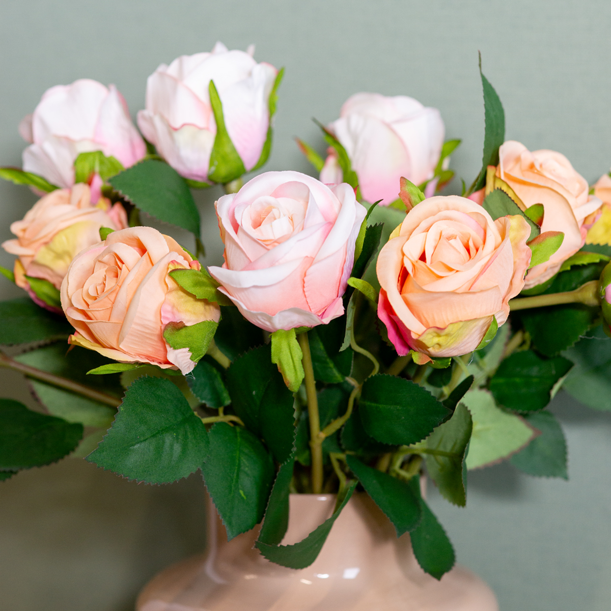 Sie lieben den Charme von Rosen, möchten aber auf die Pflege verzichten? Kein Problem! Mit unserem künstlichen Rosenstrauß holen Sie sich die zeitlose Schönheit der Königin der Blumen direkt in Ihr Zuhause. Perfekt für alle, die Wert auf elegante Dekoration legen, ohne auf Frische angewiesen zu sein. Ob als Blickfang im Wohnzimmer, als bezaubernde Tischdekoration bei besonderen Feiern oder als stilvolles Geschenk – dieser Rosenstrauß verleiht jedem Raum eine besondere Atmosphäre. Die zarten rosa Seidenblüten in Kombination mit grünen Blättern wirken so täuschend echt, dass Sie fast vergessen könnten, dass es sich um Kunstblumen handelt. Ihre Gäste werden staunen!