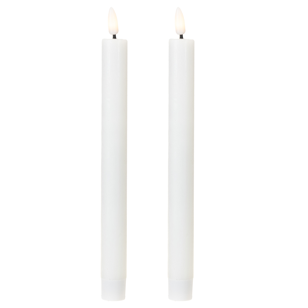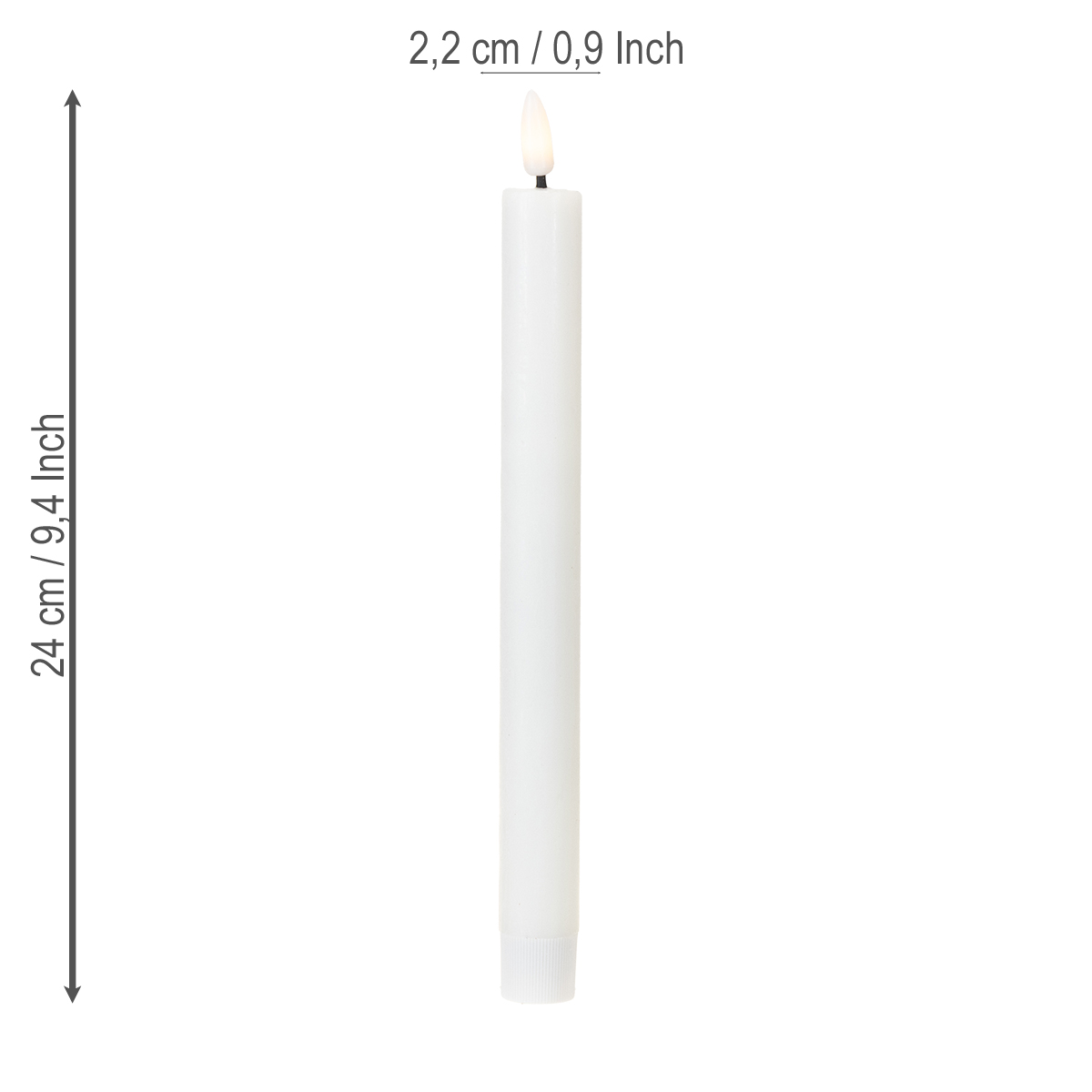 Sie lieben den warmen Schein von Kerzen, möchten jedoch auf echte Flammen verzichten? Dann sind unsere LED-Stabkerzen in Weiß die perfekte Wahl! Mit ihrem zeitlosen Design, aus Echtwachs gefertigt und mit einem angenehmen warmweißen Licht zaubern diese batteriebetriebenen LED-Kerzen in jeder Umgebung ein stimmungsvolles Ambiente. Egal, ob für romantische Abendessen, eine Feier oder gemütliche Abende zu Hause – diese LED-Kerzen mit Flammeneffekt sind vielseitig und sicher. Keine Brandflecken auf dem Tischläufer, keine Wachsflecken, kein Ruß – einfach entspannen und den sicheren Kerzenschein genießen. Kombinieren Sie die 24,5 cm hohen Kerzen mit dekorativen Kandelabern oder einem Adventskranz, und Sie werden staunen, wie elegant sie Ihre Dekoration ergänzen.