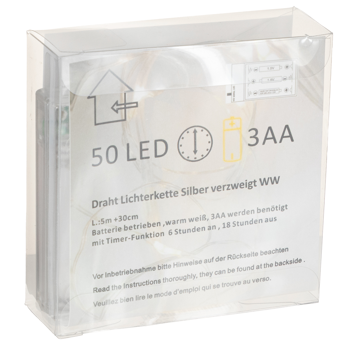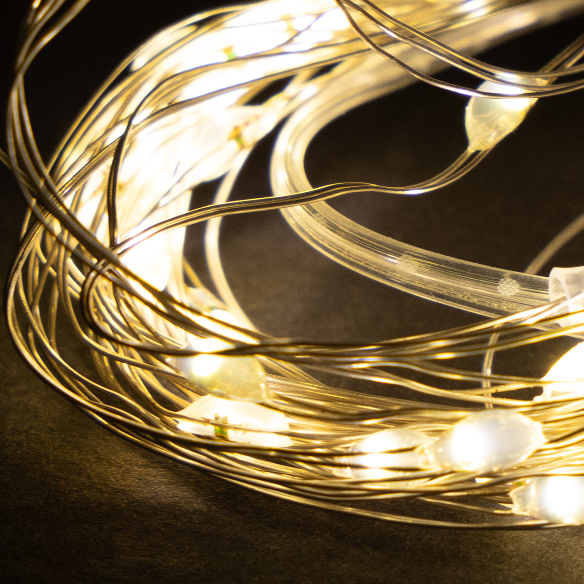 Die 5 Meter lange LED-Lichterkette für Batterien und einem warm-weißen Licht benötigt lediglich 3 AA-Batterien, damit die 50 einzelnen LEDs, die einen Abstand von 10 Zentimeter zueinander haben, kräftig leuchten. Dabei beträgt die Zuleitung von den Batterien zu der ersten LED 30 Zentimeter.