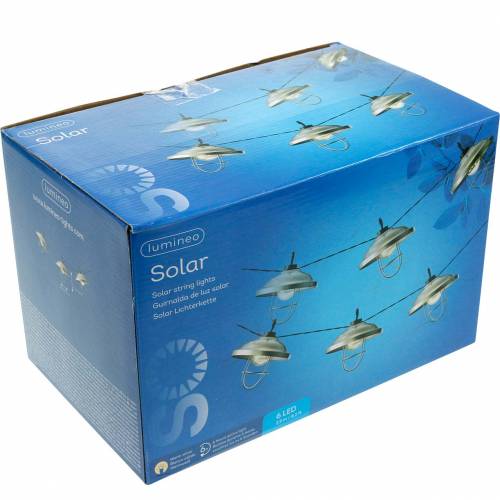Die Solar-Lichterkette in Warmweiß mit 6 LED-Lichtern wird in einer Papp-Box geliefert. Der LED-Strang besitzt mit Zuleitung eine Gesamtlänge von circa 5 Metern. Die mit Lampen bestückte Lichterkette ist etwa 250 Zentimeter lang, die Lampen sind etwa mit 50 Zentimeter Abstand zueinander angebracht. Die 6 LED-Lampen besitzen mit Aufhängung eine ungefähre Höhe von 14 Zentimetern sowie einen Durchmesser von etwa 13 Zentimetern.