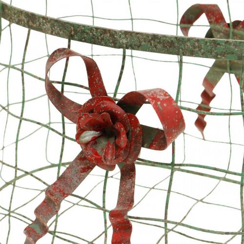 Dieses Pflanzgefäß ist ein wirklich entzückender Henkelkorb im Stil einer metallenen Handtasche. Der hübsche Drahtkorb mit Henkeln besteht aus einem künstlich gealterten Drahtgeflecht mit Anklängen von Rost und Grünspan. An beiden Seiten schmücken jeweils eine große Schleife in Rot, aus metallenen Band gefertigt und mit einer roten Rose im Zentrum der Schleife verziert, den großen Drahtkorb. Auch das Schleifendekor ist im Stil des antiken Shabby Chic, mit Ablagerungen und Farbabtragungen versehen. Gebogene Henkel mit zu Spiralen gedrehten Griffen vervollständigen die Optik der metallene Handtasche.Tipp: Der schöne Korb mit Griffen im Stil einer Henkeltasche kann auch ganz wunderbar mit dem kleineren Pflanzkorb im selben Stil, aus unserem umfangreichen Sortiment an Pflanztöpfen aus Metallgeflecht, kombiniert werden!