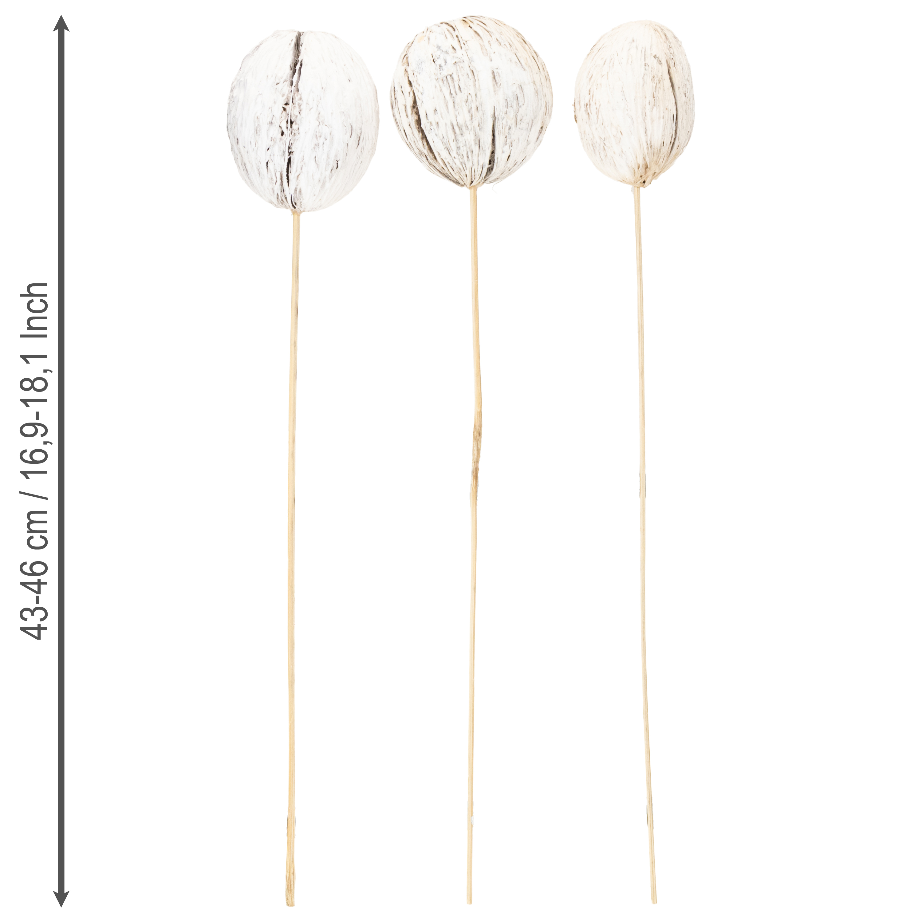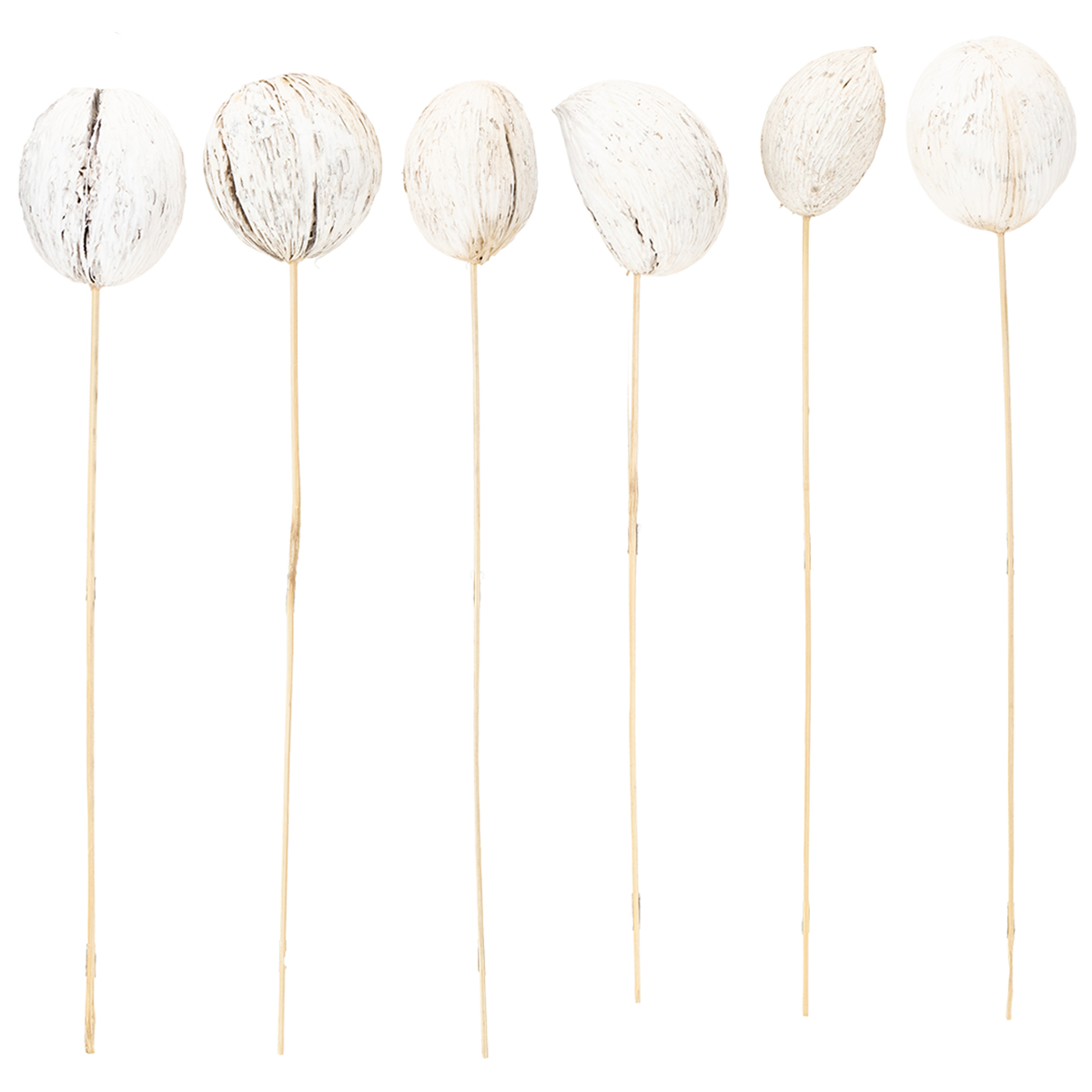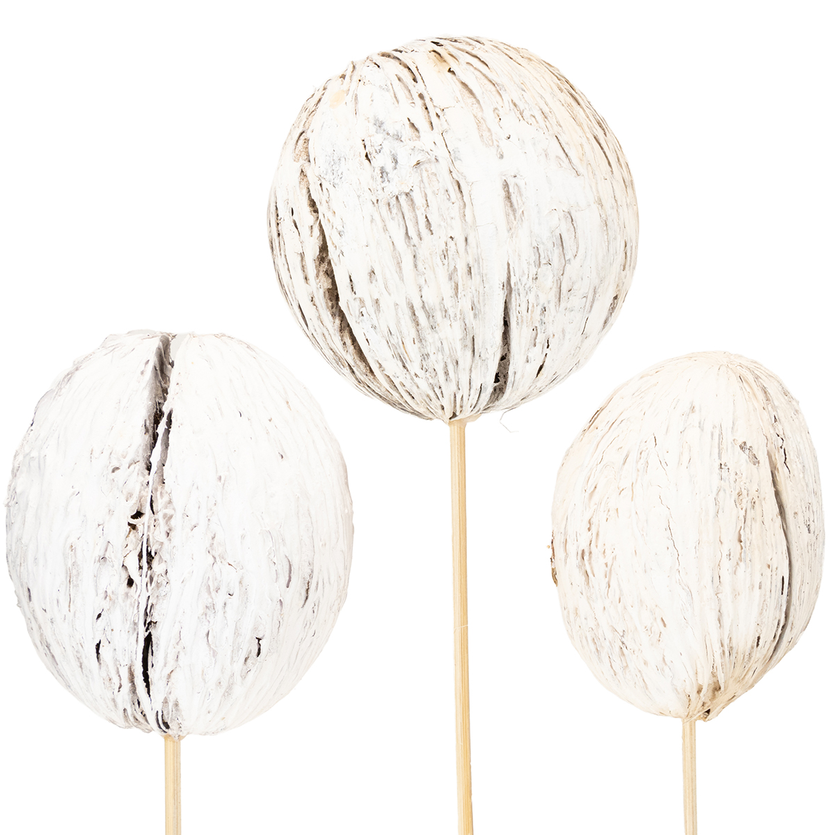 Da die kleinen Deko-Bälle ganz praktisch auf lange Holzstiele geklebt wurden, ist es sogar noch einfacher, sie dekorativ einzusetzen: Stellen Sie sie zusammen mit anderen exotischen Naturmaterialien wie Bull Cup, Cane Cone und Palmspear in eine Vase und kreieren Sie auf diese Weise eine tolle Tisch- beziehungsweise auch Raumdekoration. Zudem können Sie die Holzkugeln durch die Stäbe leicht in Erde oder Steckschaum befestigen, was es ungemein erleichtert, zum Beispiel Ihre Blumentöpfe zuhause zu verschönern oder die Deko-Früchte in ein Trauergesteck einzuarbeiten. Dazu können Sie die Stiele natürlich auch entfernen und die Mintolla-Nüsse in einer Schale oder vielleicht auch einem getrockneten Bananenblatt auf eine Kommode oder ein Fensterbrett zu stellen. Der originelle Eyecatcher, der auf diese Weise entsteht, zieht garantiert alle Blicke auf sich!