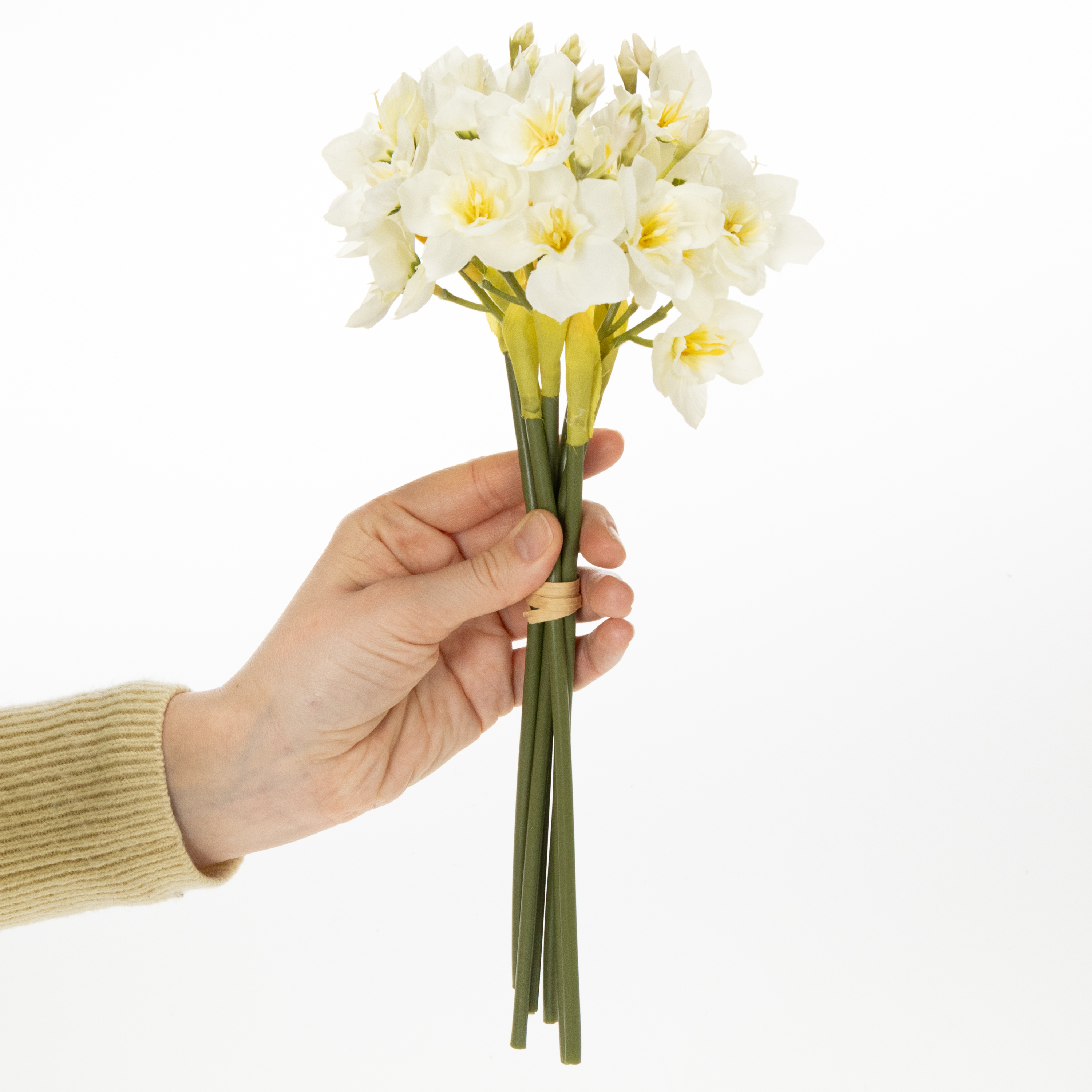 Der perfekte Akzent für Ihre Hochzeit oder saisonale Blumendekoration: Unser Narzissenzweig vereint Schönheit und praktische Vielseitigkeit. Stellen Sie sich vor, wie diese kunstvoll gestalteten weißen Blüten Ihre Tischdekoration ergänzen oder einen romantischen Brautstrauß zaubern. Ihre Gäste werden begeistert sein! Mit einer Länge von 33 cm und einer naturgetreuen Gestaltung wirken diese künstlichen Narzissen wie frisch gepflückt – und das ganz ohne Pflege.