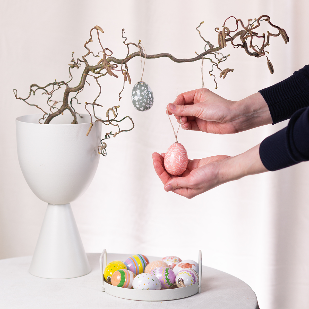 Mit einer Höhe von 6 cm und einem Durchmesser von 4 cm sind die Ostereier wunderbar proportioniert, um sowohl dezent als auch präsent zu wirken. Das Material aus stabilem Kunststoff in fröhlich-lebendigem Design macht sie besonders langlebig – ideal also für die wiederholte Verwendung in den kommenden Jahren. Die kunstvollen Muster, die in zarten Pastelltönen gehalten sind, passen perfekt zu einem modernen Look oder auch zum gemütlichen Landhausstil. Kombiniert mit anderen Dekoartikeln wie kleinen Keramikhäschen oder feinem Moos wirken sie besonders harmonisch.