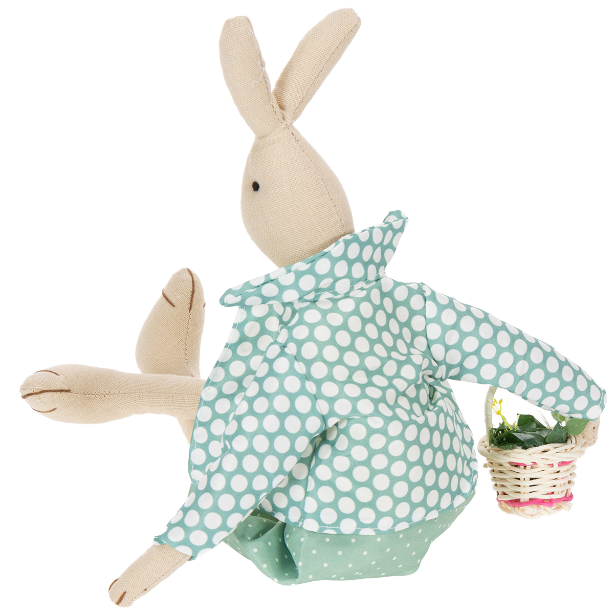 Dieser Hasenjunge wurde detailverliebt in Handarbeit hergestellt. Der Hase wurde aus natürlichem Stoff gefertigt und mit einem gelben Hemd mit weißen Pünktchen und Holzknöpfen, einer Hose und einer passenden Jacke in Türkis, ebenfalls mit Punktmuster bekleidet. Um den Hals trägt der Osterhase mit Kleidung eine schlichte Papierschleife. Mitgebracht hat der Hasenmann einem kleinen bepflanzten Blumenkorb.