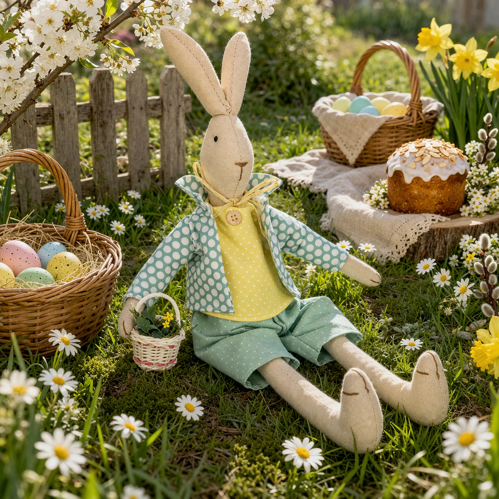 Produktname: Osterhase aus Stoff, Hase mit Kleidung, Osterdeko, Hasenjunge H46cm